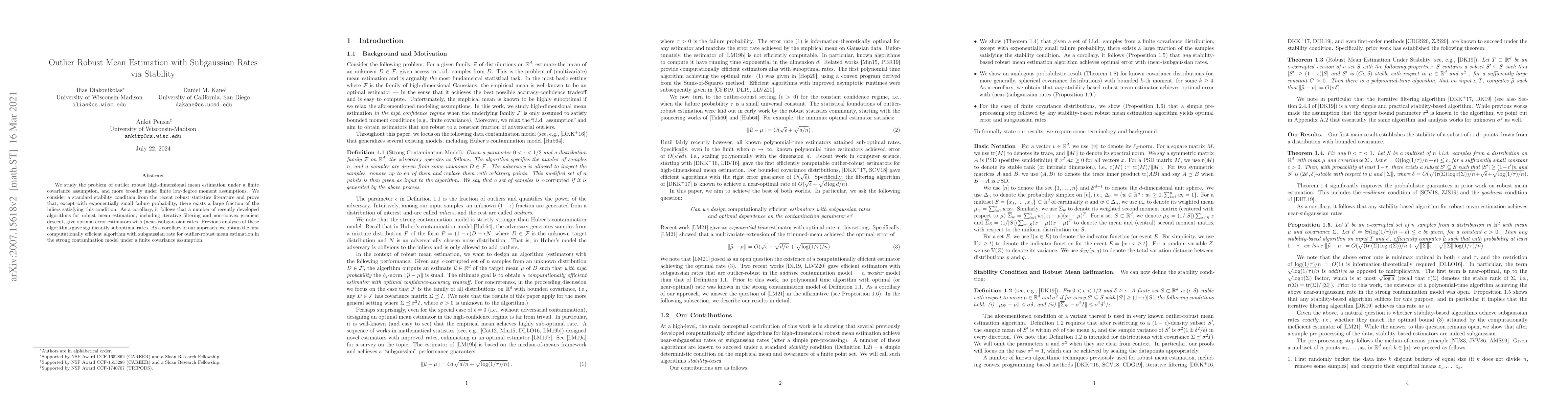 This paper addresses the problem of robust high-dimensional mean estimation under finite covariance assumptions, proving optimal (near-)subgaussian rates for several algorithms. It introduces a stability condition to ensure a large fraction of inliers satisfy it, leading to the first computationally efficient algorithm achieving subgaussian rates in the strong contamination model.