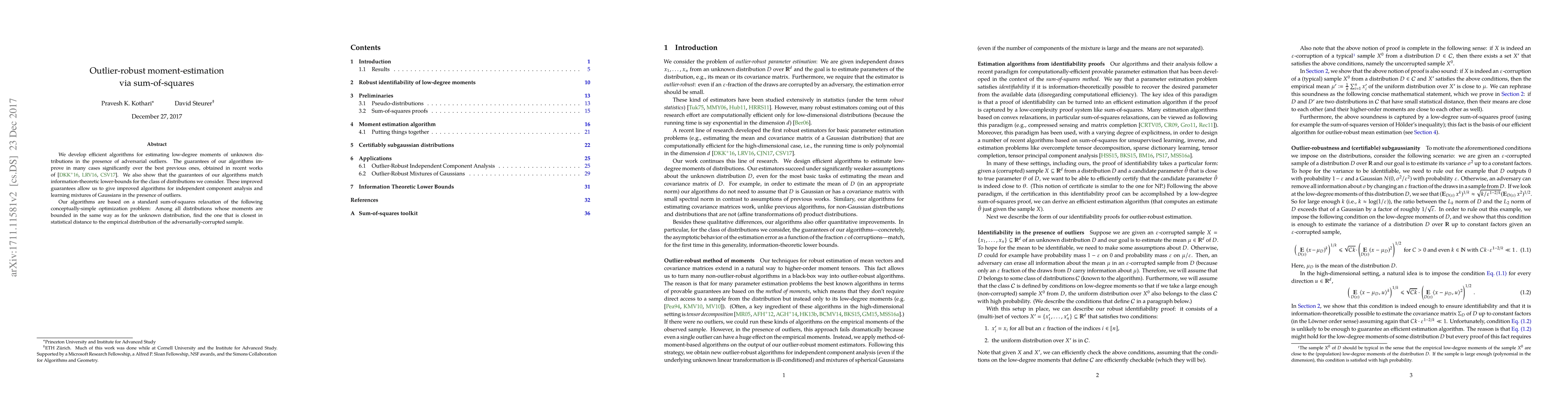 We develop efficient algorithms for estimating low-degree moments of unknown distributions in the presence of adversarial outliers. The guarantees of our algorithms improve in many cases significantly over the best previous ones, obtained in recent works of Diakonikolas et al, Lai et al, and Charikar et al. We also show that the guarantees of our algorithms match information-theoretic lower-bounds for the class of distributions we consider. These improved guarantees allow us to give improved algorithms for independent component analysis and learning mixtures of Gaussians in the presence of outliers. Our algorithms are based on a standard sum-of-squares relaxation of the following conceptually-simple optimization problem: Among all distributions whose moments are bounded in the same way as for the unknown distribution, find the one that is closest in statistical distance to the empirical distribution of the adversarially-corrupted sample.