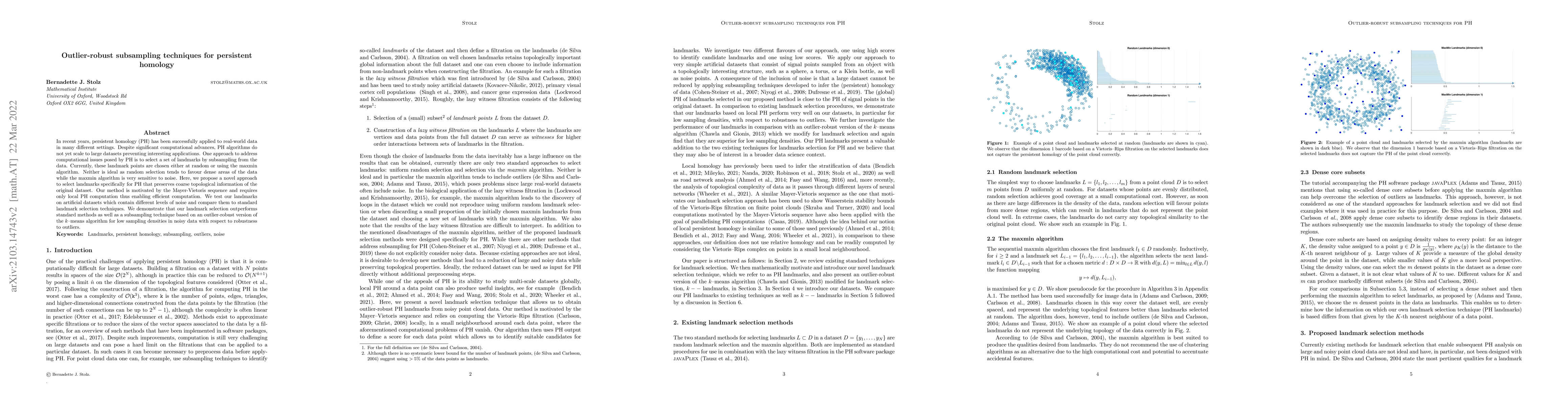 In recent years, persistent homology (PH) has been successfully applied to real-world data in many different settings. Despite significant computational advances, PH algorithms do not yet scale to large datasets preventing interesting applications. One approach to address computational issues posed by PH is to select a set of landmarks by subsampling from the data. Currently, these landmark points are chosen either at random or using the maxmin algorithm. Neither is ideal as random selection tends to favour dense areas of the data while the maxmin algorithm is very sensitive to noise. Here, we propose a novel approach to select landmarks specifically for PH that preserves coarse topological information of the original dataset. Our method is motivated by the Mayer-Vietoris sequence and requires only local PH computation thus enabling efficient computation. We test our landmarks on artificial datasets which contain different levels of noise and compare them to standard landmark selection techniques. We demonstrate that our landmark selection outperforms standard methods as well as a subsampling technique based on an outlier-robust version of the $k$--means algorithm for low sampling densities in noisy data with respect to robustness to outliers.