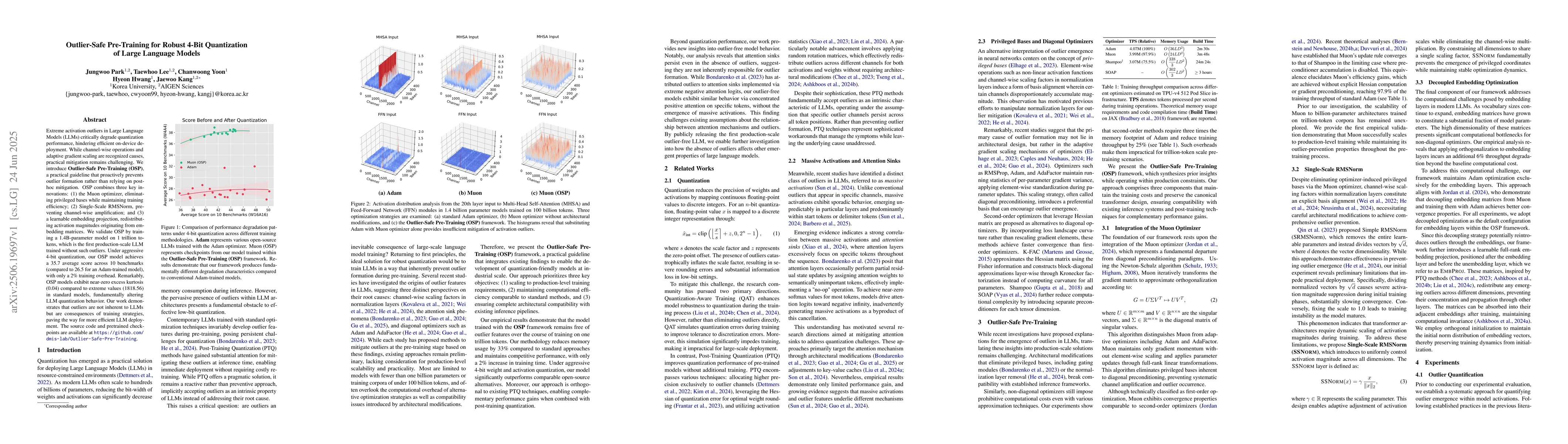 The research introduces Outlier-Safe Pre-Training (OSP) for robust 4-bit quantization of large language models, utilizing the Muon optimizer, Single-Scale RMSNorm, and learnable embedding projections to prevent outlier formation during training.