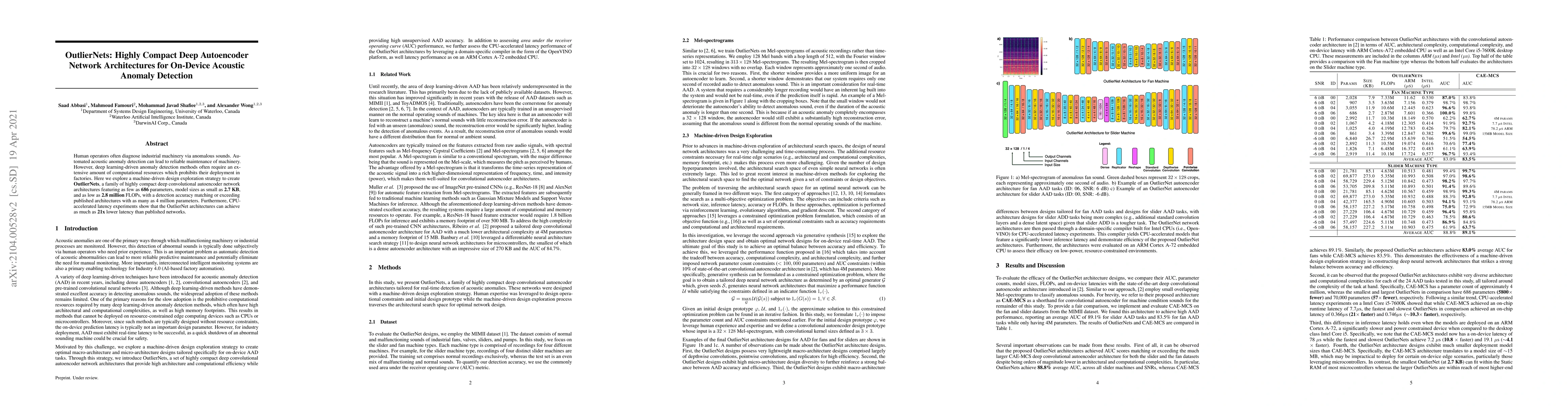 OutlierNets are compact deep convolutional autoencoder architectures designed for on-device acoustic anomaly detection, requiring minimal computational resources while maintaining high detection accuracy. These networks achieve significantly lower latency compared to larger architectures, making them suitable for factory deployment.