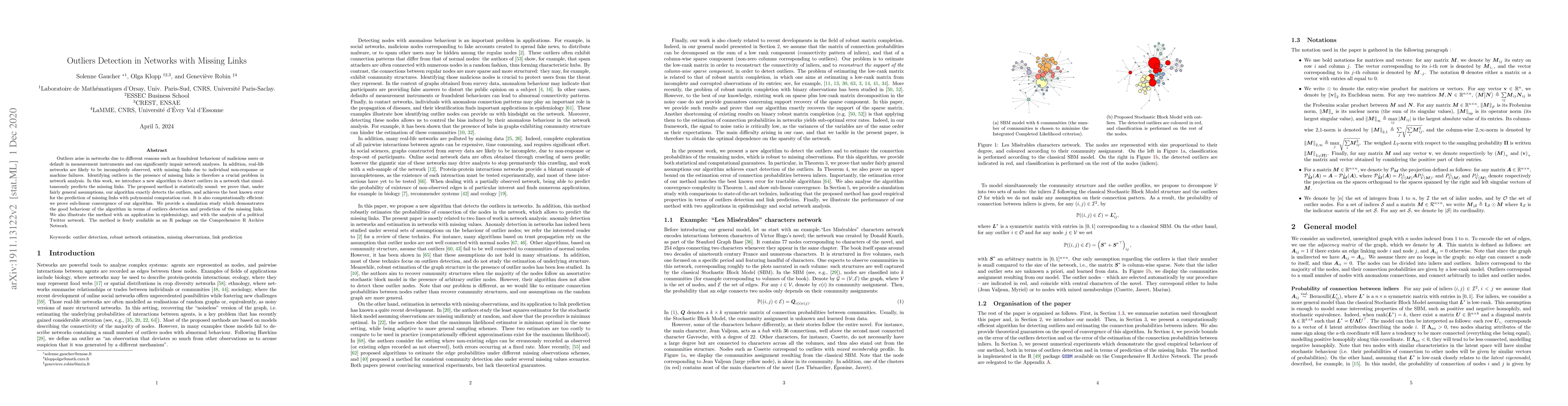 This paper introduces a new algorithm for detecting outliers in networks while simultaneously predicting missing links, proving its statistical accuracy and computational efficiency. The method is demonstrated through simulations and applications in epidemiology and political Twitter analysis, and is available as an R package.