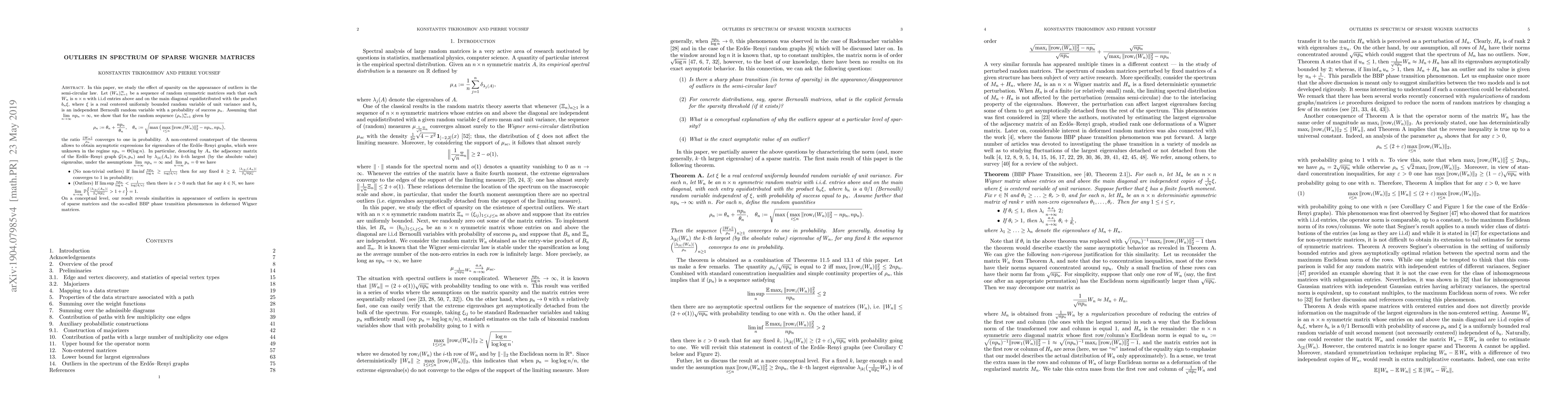 This paper explores how sparsity affects the emergence of outliers in the spectrum of sparse Wigner matrices, demonstrating that under certain conditions, the ratio of the matrix norm to a specific sequence converges to one in probability. It also extends findings to the eigenvalues of Erdős-Rényi graphs, showing the absence of outliers under high connection density and the presence of outliers under low connection density, analogous to the BBP phase transition phenomenon.