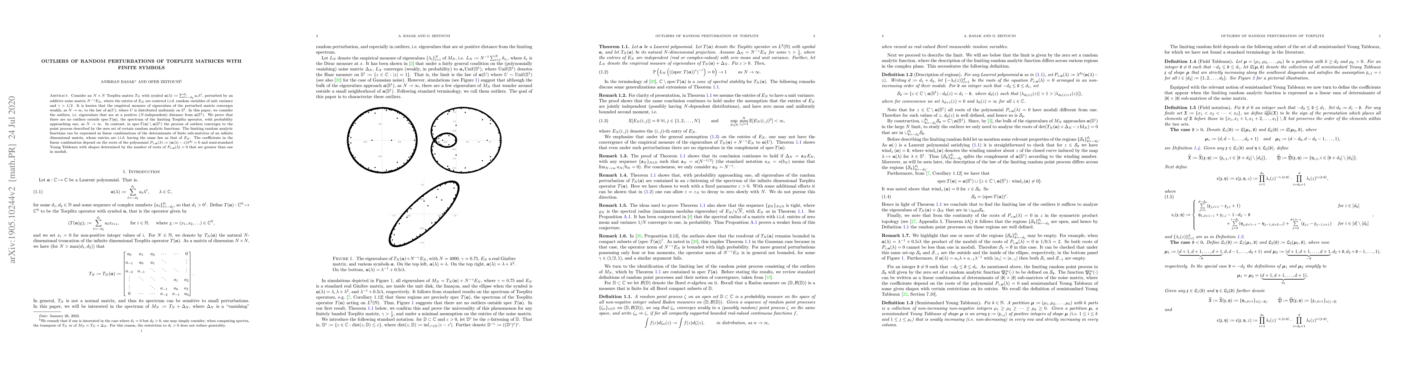 This paper investigates the eigenvalues of perturbed Toeplitz matrices with finite symbols, proving that no outliers exist outside the spectrum of the limiting Toeplitz operator as matrix size tends to infinity. Within the spectrum, outliers converge to a point process linked to the zero set of random analytic functions, which are linear combinations of determinants of sub-matrices of an infinite-dimensional matrix.
