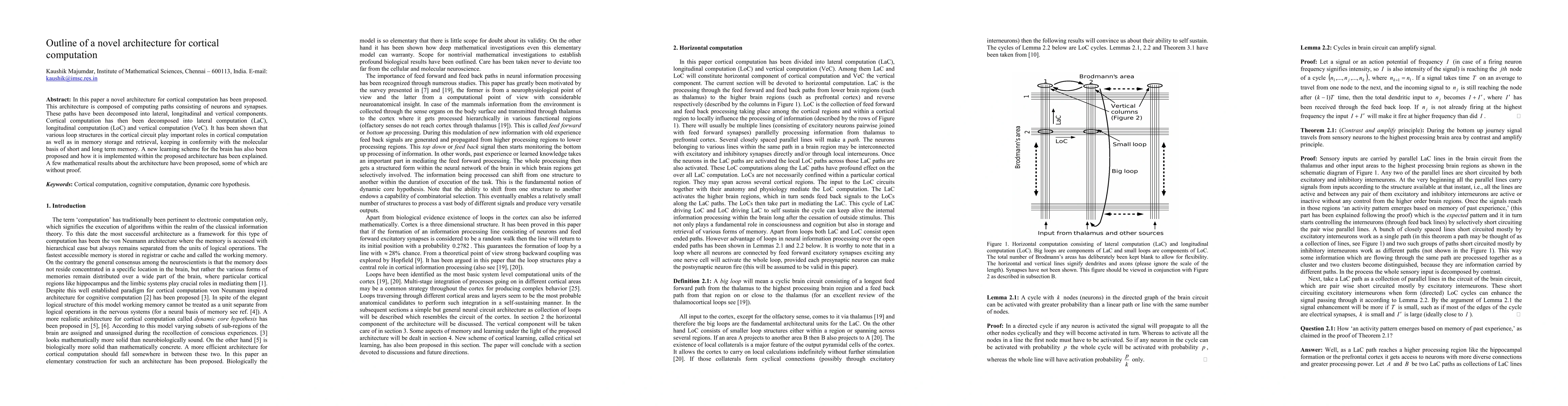 This paper proposes a novel architecture for cortical computation based on lateral, longitudinal, and vertical computing paths, introducing concepts of lateral, longitudinal, and vertical computations. It also presents a new learning scheme and discusses the role of loop structures in memory storage and retrieval, though many mathematical results are proposed without proof.