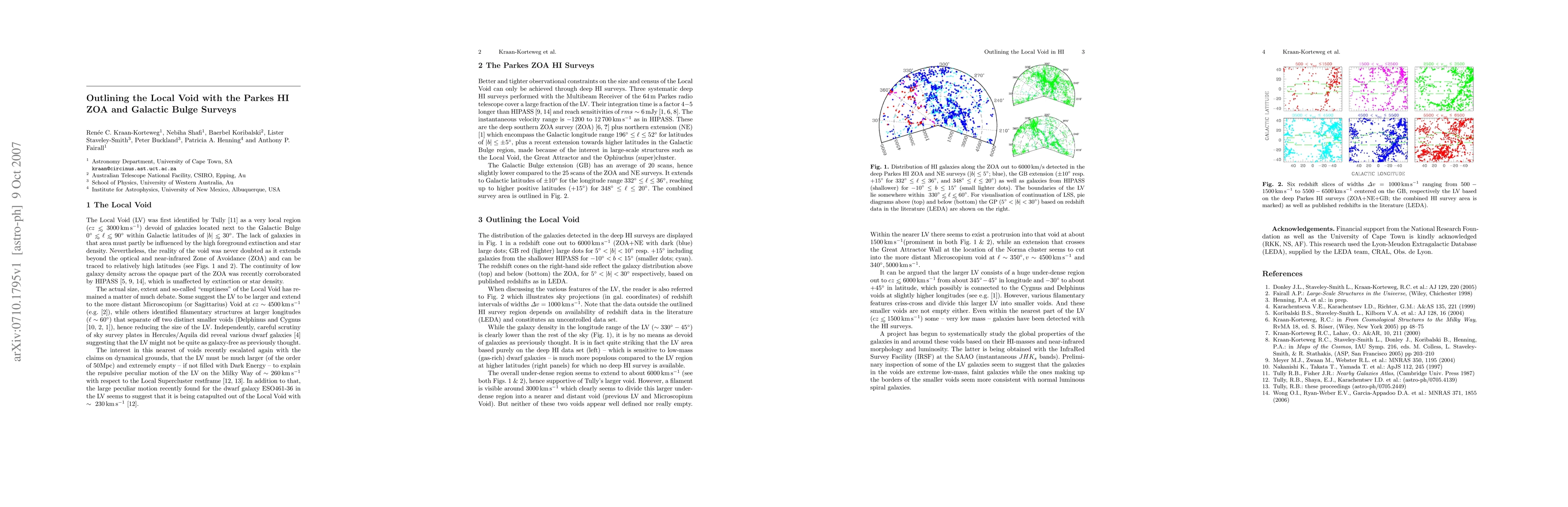 The Parkes deep HI ZOA survey has been extended between 2002 and 2004 towards higher latitudes in the Galactic Bulge region. This area of extreme star crowding and high extinction levels remains impenetrable at any other waveband regime. Preliminary results of the 3 dimensional distribution based on the combined HI-surveys are presented. We focus on the extent and "content" of the Local Void as outlined by these HI surveys, followed by a preliminary discussion of the properties of the few galaxies detected in the Local Void.
