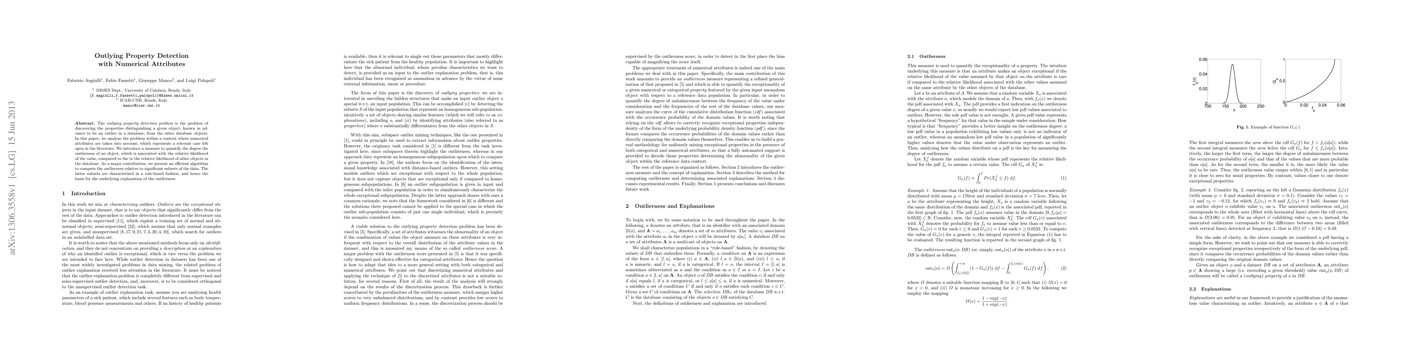 The outlying property detection problem is the problem of discovering the properties distinguishing a given object, known in advance to be an outlier in a database, from the other database objects. In this paper, we analyze the problem within a context where numerical attributes are taken into account, which represents a relevant case left open in the literature. We introduce a measure to quantify the degree the outlierness of an object, which is associated with the relative likelihood of the value, compared to the to the relative likelihood of other objects in the database. As a major contribution, we present an efficient algorithm to compute the outlierness relative to significant subsets of the data. The latter subsets are characterized in a "rule-based" fashion, and hence the basis for the underlying explanation of the outlierness.