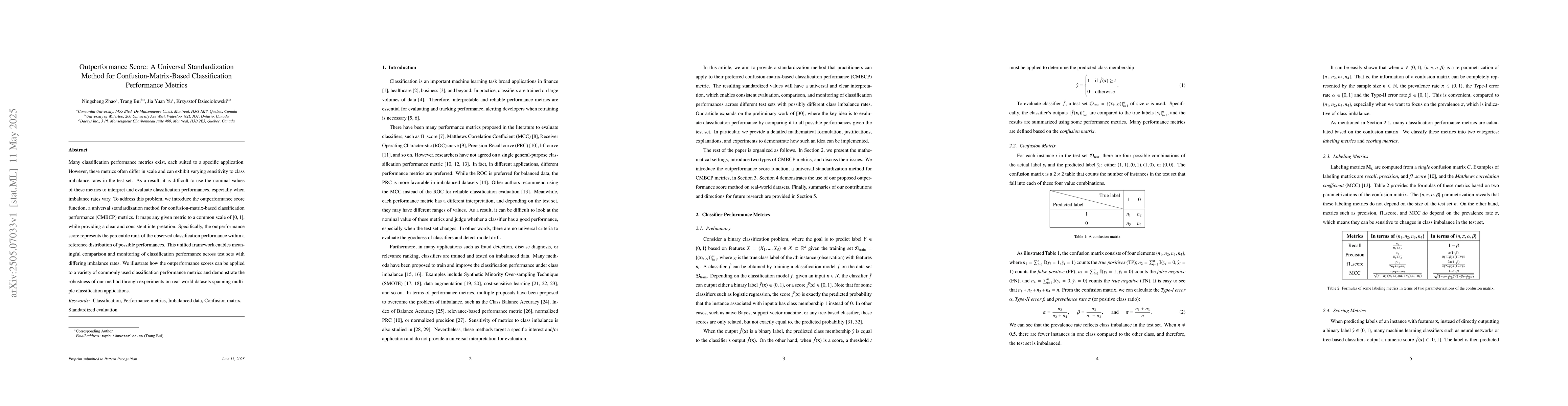 The research introduces the Outperformance Score, a universal standardization method for confusion-matrix-based classification performance metrics, mapping any given metric to a common scale of [0,1] based on percentile rank within a reference distribution.