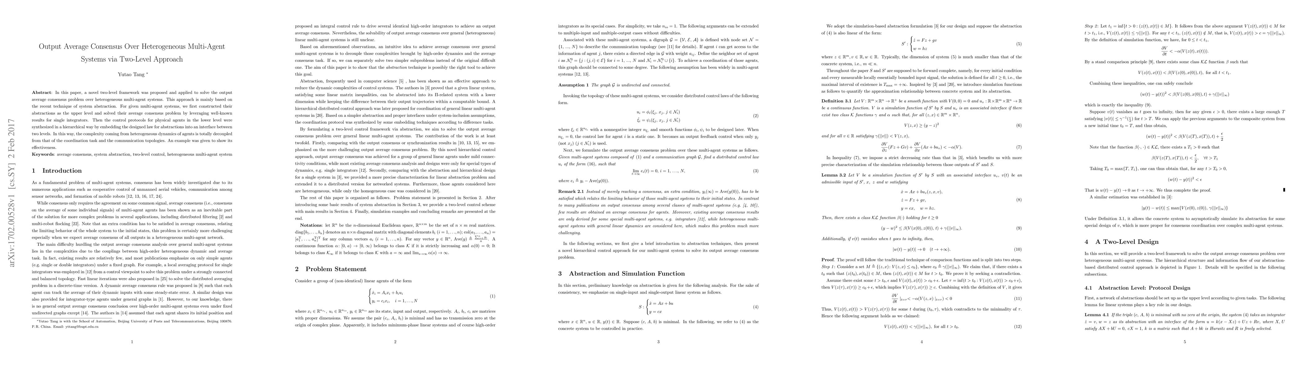 In this paper, a novel two-level framework was proposed and applied to solve the output average consensus problem over heterogeneous multi-agent systems. This approach is mainly based on the recent technique of system abstraction. For given multi-agent systems, we first constructed their abstractions as the upper level and solved their average consensus problem by leveraging well-known results for single integrators. Then the control protocols for physical agents in the lower level were synthesized in a hierarchical way by embedding the designed law for abstractions into an interface between two levels. In this way, the complexity coming from heterogeneous dynamics of agents is totally decoupled from that of the coordination task and the communication topologies. An example was given to show its effectiveness.