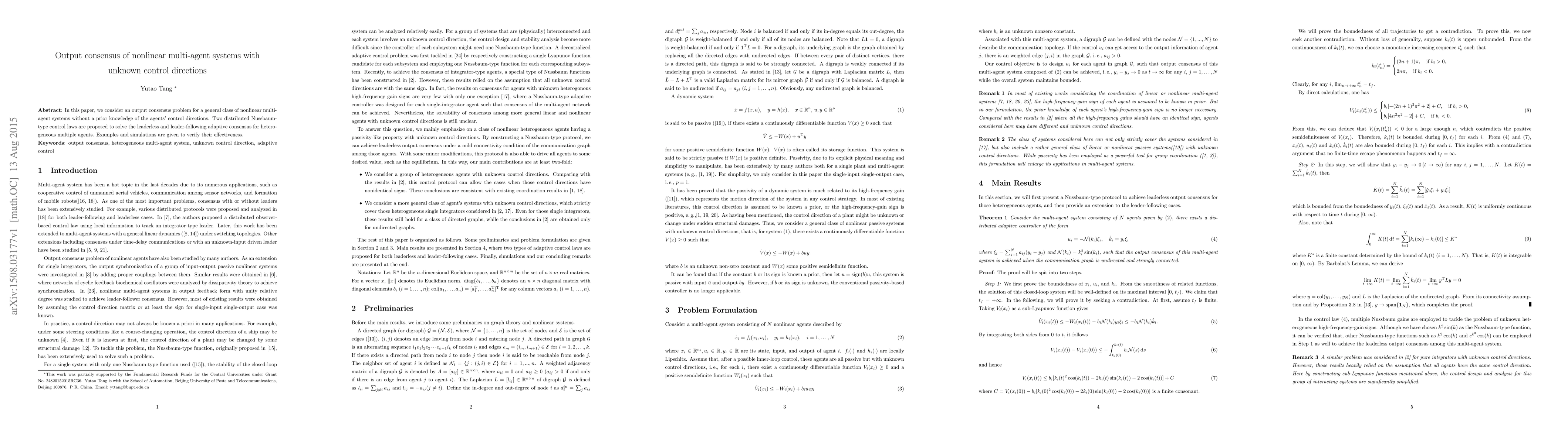 This paper proposes distributed Nussbaum-type control laws to achieve output consensus in nonlinear multi-agent systems without prior knowledge of control directions. The methods are validated through simulations for both leaderless and leader-following adaptive consensus scenarios.