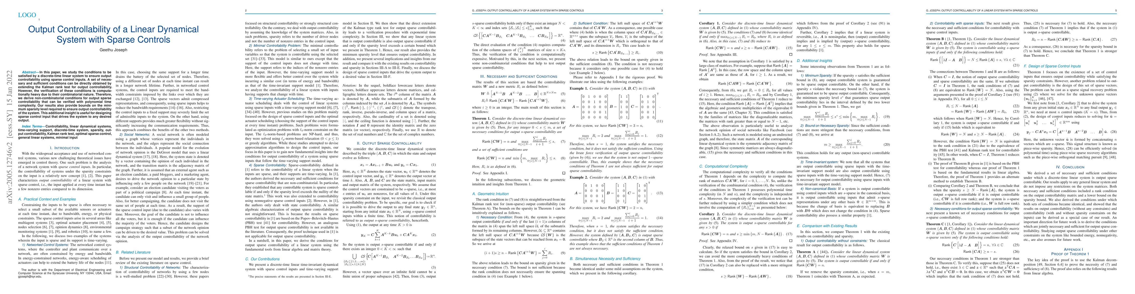 In this paper, we study the conditions to be satisfied by a discrete-time linear system to ensure output controllability using sparse control inputs. A set of necessary and sufficient conditions can be directly obtained by extending the Kalman rank test for output controllability. However, the verification of these conditions is computationally heavy due to their combinatorial nature. Therefore, we derive non-combinatorial conditions for output sparse controllability which can be verified with polynomial time complexity. Our results also provide bounds on the minimum sparsity level required to ensure output controllability of the system. This additional insight is useful for designing sparse control input that drives the system to any desired output.