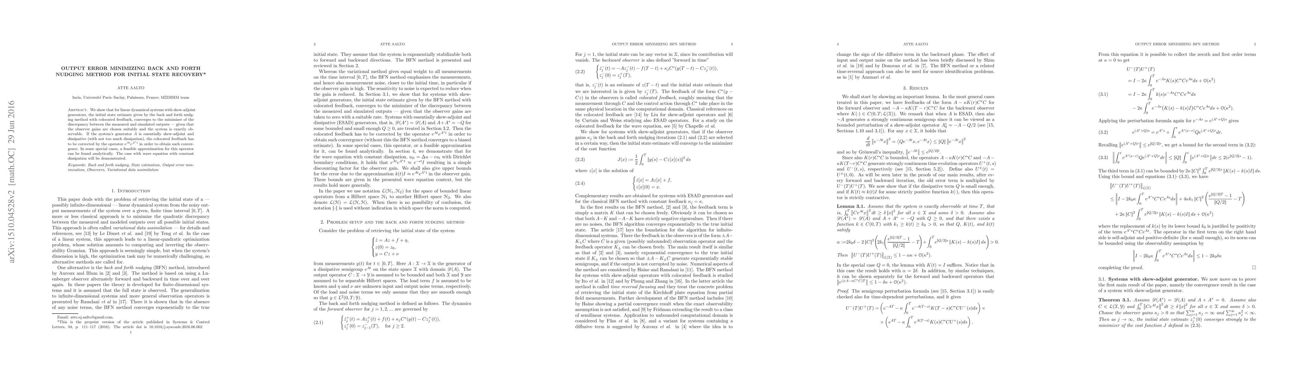 We show that for linear dynamical systems with skew-adjoint generators, the initial state estimate given by the back and forth nudging method with colocated feedback, converges to the minimizer of the discrepancy between the measured and simulated outputs - given that the observer gains are chosen suitably and the system is exactly observable. If the system's generator A is essentially skew-adjoint and dissipative (with not too much dissipation), the colocated feedback has to be corrected by the operator e^{At}e^{A*t} in order to obtain such convergence. In some special cases, a feasible approximation for this operator can be found analytically. The case with wave equation with constant dissipation will be demonstrated.