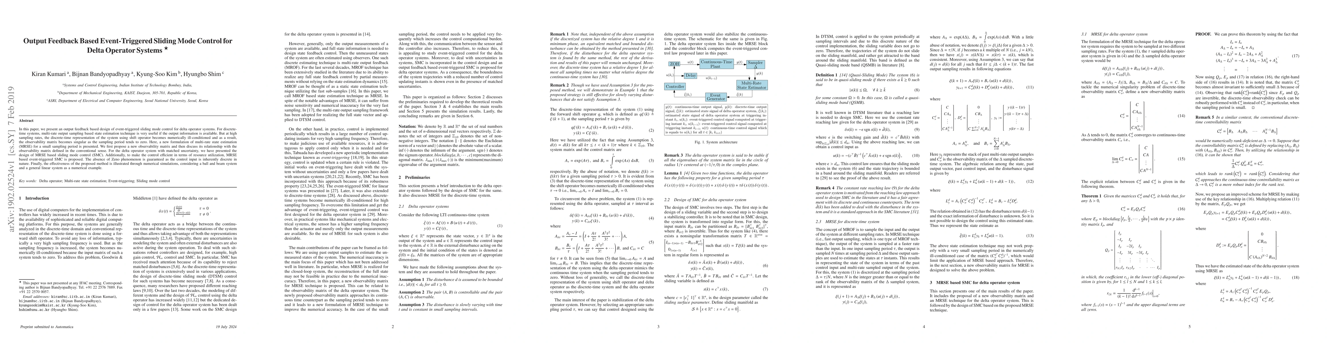This paper proposes an output feedback based event-triggered sliding mode control for delta operator systems, addressing numerical ill-conditioning issues in multi-rate state estimation. It introduces a new observability matrix and presents a design for efficient control with guaranteed absence of the Zeno phenomenon, demonstrated through simulations on a ball and beam system.
