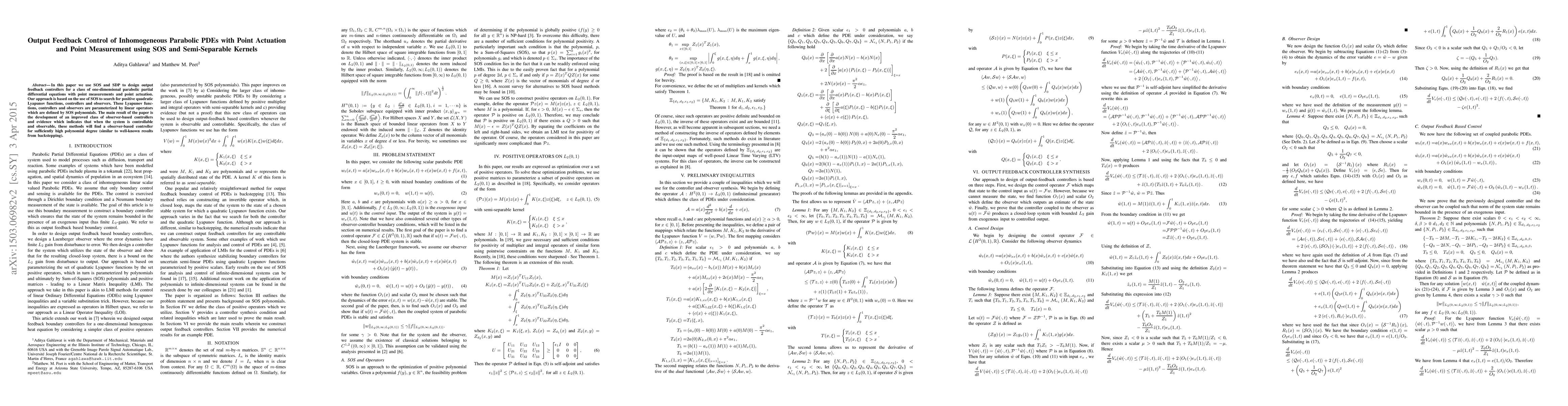 This paper designs output feedback controllers for inhomogeneous parabolic PDEs using SOS and SDP, focusing on point actuation and measurement. It leverages SOS to find positive quadratic Lyapunov functions and controllers, showing that high-degree polynomials can yield observer-based controllers when the system is controllable and observable.