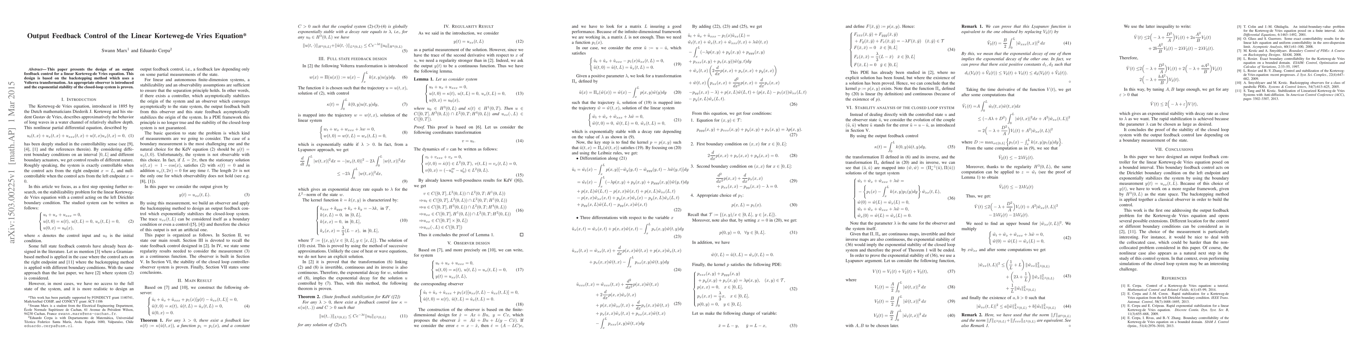 - This paper presents the design of an output feedback control for a linear Korteweg-de Vries equation. This design is based on the backstepping method which uses a Volterra transformation. An appropriate observer is introduced and the exponential stability of the closed-loop system is proven.