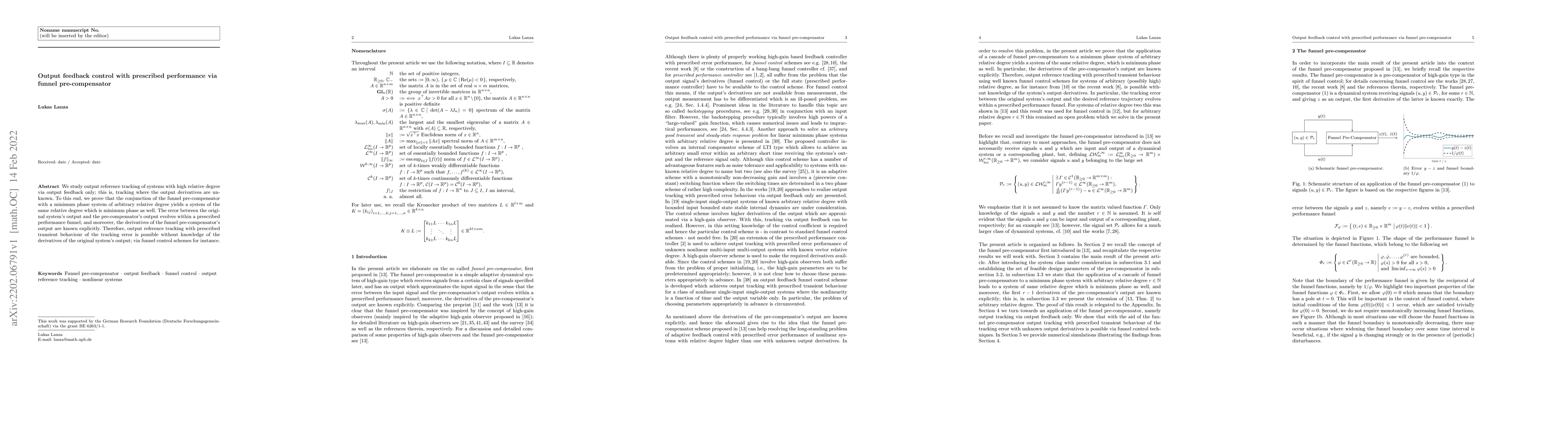 We study output reference tracking of systems with high relative degree via output feedback only; this is, tracking where the output derivatives are unknown. To this end, we prove that the conjunction of the funnel pre-compensator with a minimum phase system of arbitrary relative degree yields a system of the same relative degree which is minimum phase as well. The error between the original system's output and the pre-compensator's output evolves within a prescribed performance funnel; and moreover, the derivatives of the funnel pre-compensator's output are known explicitly. Therefore, output reference tracking with prescribed transient behaviour of the tracking error is possible without knowledge of the derivatives of the original system's output; via funnel control schemes for instance.