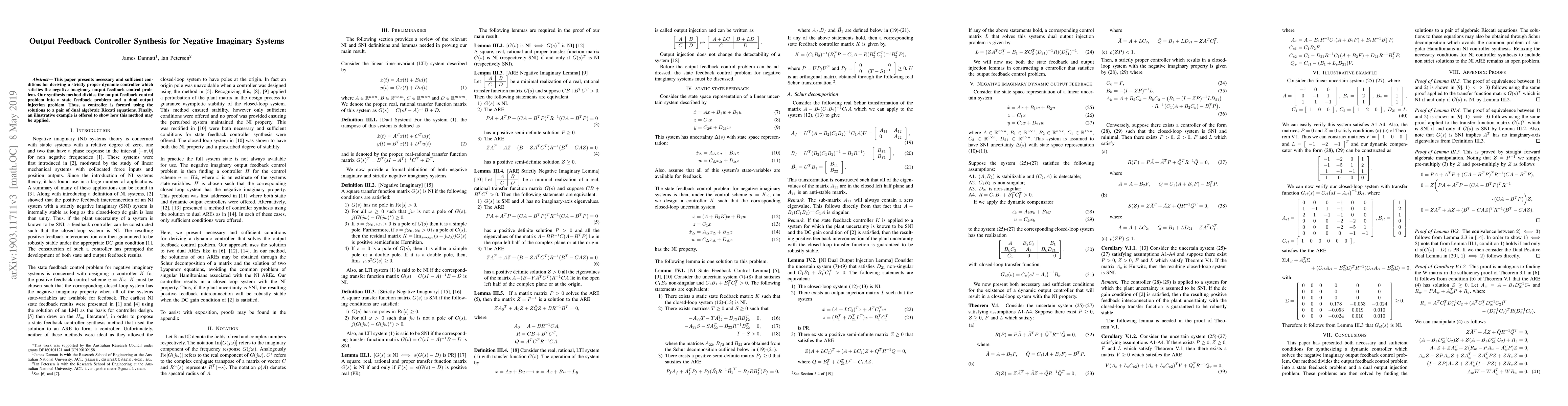 This paper presents necessary and sufficient conditions for deriving a strictly proper dynamic controller which satisfies the negative imaginary output feedback control problem. Our synthesis method divides the output feedback control problem into a state feedback problem and a dual output injection problem. Thus, a controller is formed using the solutions to a pair of dual algebraic Riccati equations. Finally, an illustrative example is offered to show how this method may be applied.