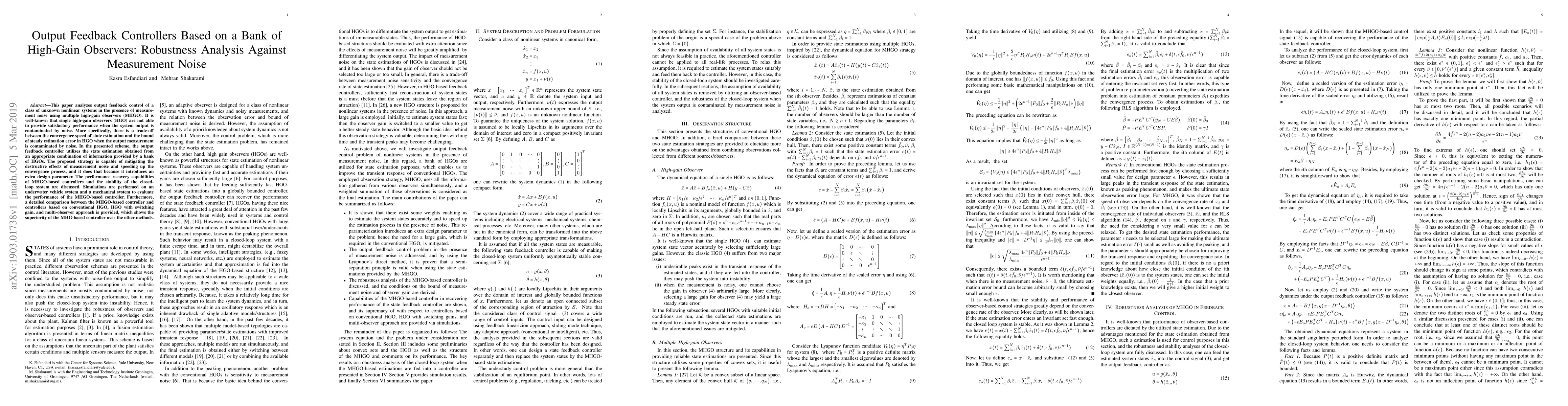 This paper proposes an output feedback control strategy using a bank of high-gain observers (MHGO) to mitigate measurement noise effects in unknown nonlinear systems. The MHGO-based controller enhances convergence speed and performance recovery compared to single high-gain observers, demonstrating superior results in simulations on underwater and mechanical systems.