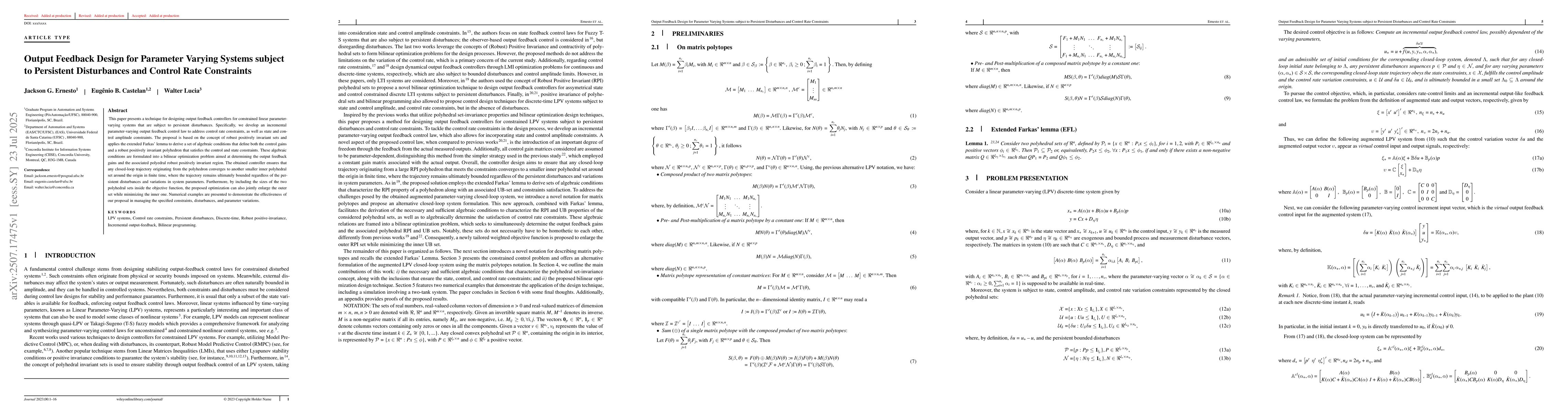 This paper presents a technique for designing output feedback controllers for constrained linear parameter-varying systems that are subject to persistent disturbances. Specifically, we develop an incremental parameter-varying output feedback control law to address control rate constraints, as well as state and control amplitude constraints. The proposal is based on the concept of robust positively invariant sets and applies the extended Farkas' lemma to derive a set of algebraic conditions that define both the control gains and a robust positively invariant polyhedron that satisfies the control and state constraints. These algebraic conditions are formulated into a bilinear optimization problem aimed at determining the output feedback gains and the associated polyedral robust positively invariant region. The obtained controller ensures that any closed-loop trajectory originating from the polyhedron converges to another smaller inner polyhedral set around the origin in finite time, where the trajectory remains ultimately bounded regardless of the persistent disturbances and variations in system parameters. Furthermore, by including the sizes of the two polyhedral sets inside the objective function, the proposed optimization can also jointly enlarge the outer set while minimizing the inner one. Numerical examples are presented to demonstrate the effectiveness of our proposal in managing the specified constraints, disturbances, and parameter variations.