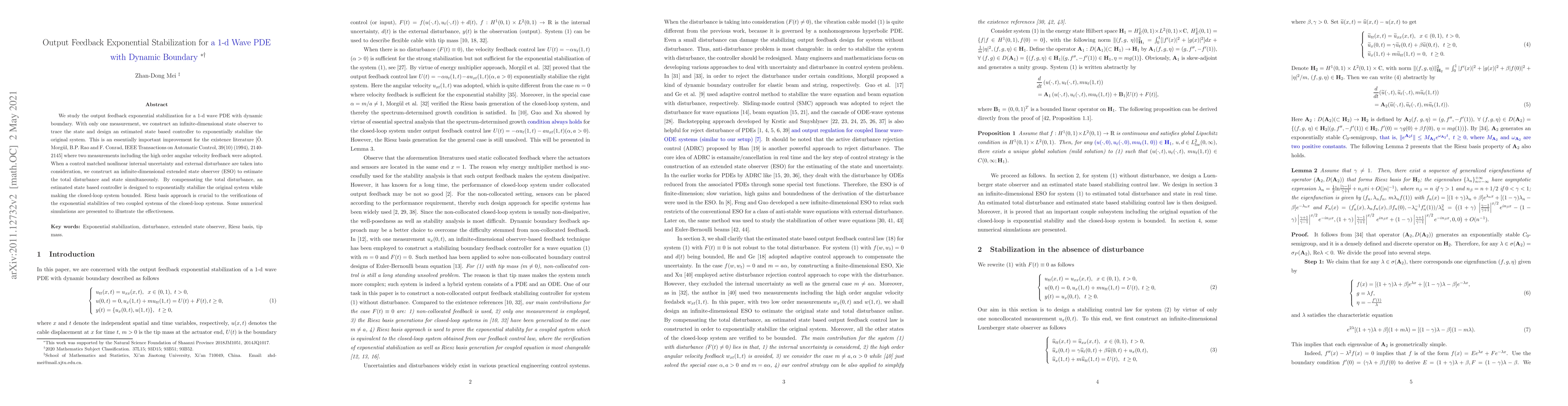 We study the output feedback exponential stabilization for a 1-d wave PDE with dynamic boundary. With only one measurement, we construct an infinite-dimensional state observer to trace the state and design an estimated state based controller to exponentially stabilize the original system. This is an essentially important improvement for the existence literature [\"{O}. Morg\"{u}l, B.P. Rao and F. Conrad, IEEE Transactions on Automatic Control, 39(10) (1994), 2140-2145] where two measurements including the high order angular velocity feedback were adopted. When a control matched nonlinear internal uncertainty and external disturbance are taken into consideration, we construct an infinite-dimensional extended state observer (ESO) to estimate the total disturbance and state simultaneously. By compensating the total disturbance, an estimated state based controller is designed to exponentially stabilize the original system while making the closed-loop system bounded. Riesz basis approach is crucial to the verifications of the exponential stabilities of two coupled systems of the closed-loop systems. Some numerical simulations are presented to illustrate the effectiveness.
