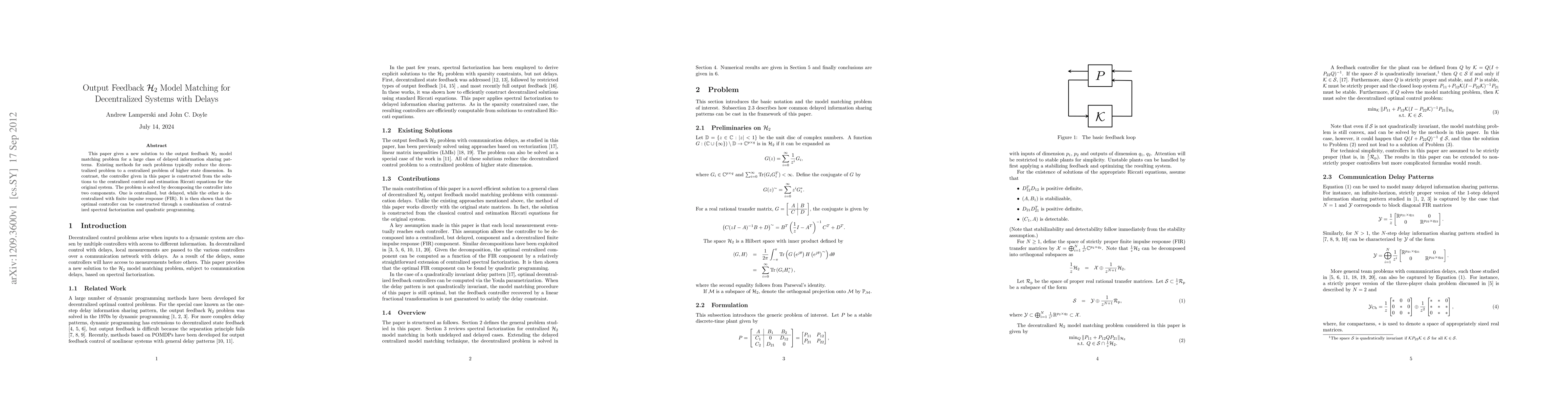 This paper gives a new solution to the output feedback H_2 model matching problem for a large class of delayed information sharing patterns. Existing methods for such problems typically reduce the decentralized problem to a centralized problem of higher state dimension. In contrast, the controller given in this paper is constructed from the solutions to the centralized control and estimation Riccati equations for the original system. The problem is solved by decomposing the controller into two components. One is centralized, but delayed, while the other is decentralized with finite impulse response (FIR). It is then shown that the optimal controller can be constructed through a combination of centralized spectral factorization and quadratic programming.