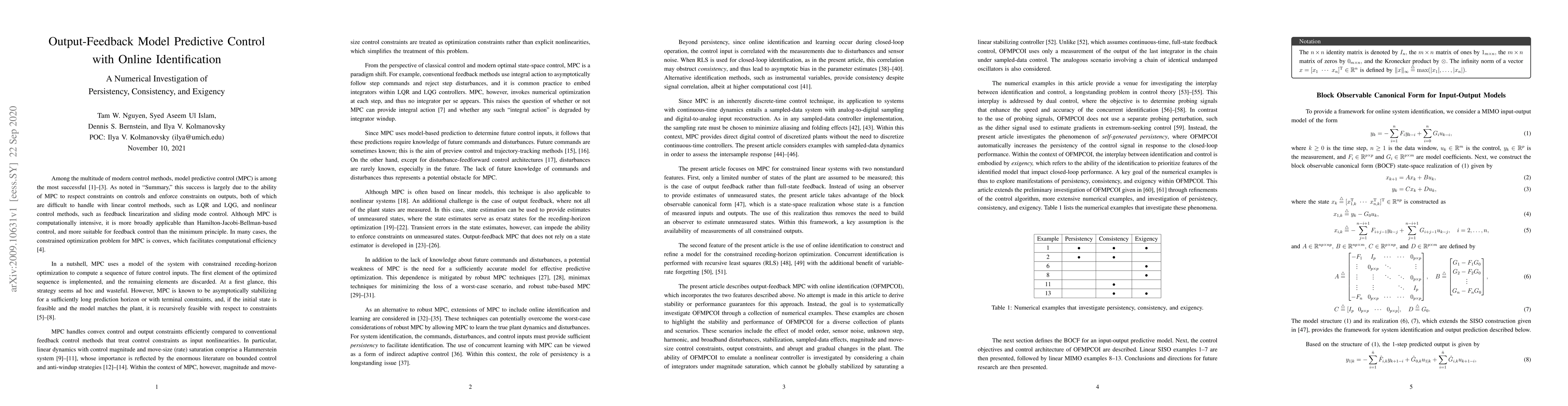 Model predictive control (MPC) is a widely used modern control technique with numerous successful application in diverse areas. Much of this success is due to the ability of MPC to enforce state and control constraints, which are crucial in many applications of control. In order to avoid the need for an observer, output-feedback model predictive control with online identification (OFMPCOI) uses the block observable canonical form whose state consists of past values of the control inputs and measured outputs. Online identification is performed using recursive least squares (RLS) with variable-rate forgetting. The article describes the algorithmic details of OFMPCOI and numerically investigates its performance through a collection of numerical examples that highlight various control challenges, such as model order uncertainty, sensor noise, prediction horizon, stabilization, magnitude and move-size saturation, and stabilization. The numerical examples are used to probe the performance of OFMPCOI in terms of persistency, consistency, and exigency. Since OFMPCOI does not employ a separate control perturbation to enhance persistency, the focus is on self-generated persistency during transient operation. For closed-loop identification using RLS, sensor noise gives rise to bias in the identified model, and the goal is to determine the effect of the lack of consistency. Finally, the numerical examples reveal exigency, which is the extent to which the online identification emphasizes model characteristics that are most relevant to meeting performance objectives.