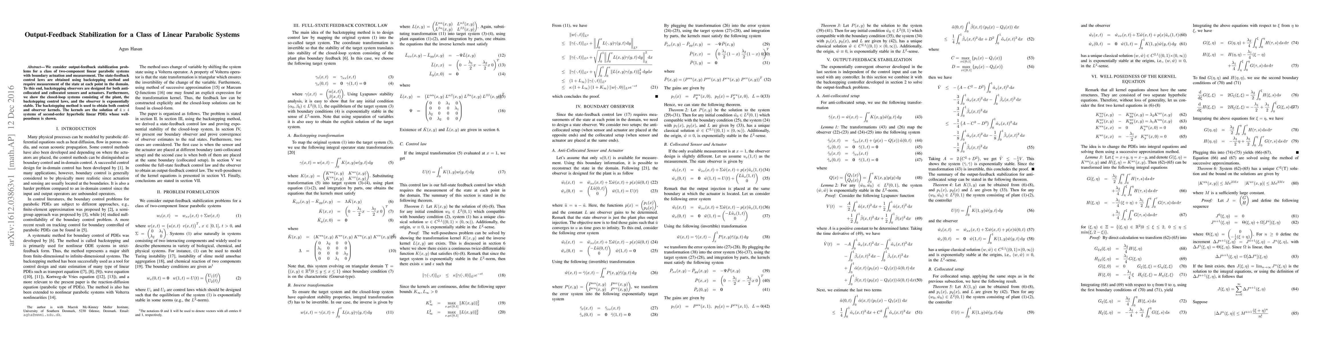 This paper addresses output-feedback stabilization for linear parabolic systems using the backstepping method. It designs backstepping observers for both collocated and anti-collocated sensor-actuator pairs, ensuring exponential stability of the closed-loop system.