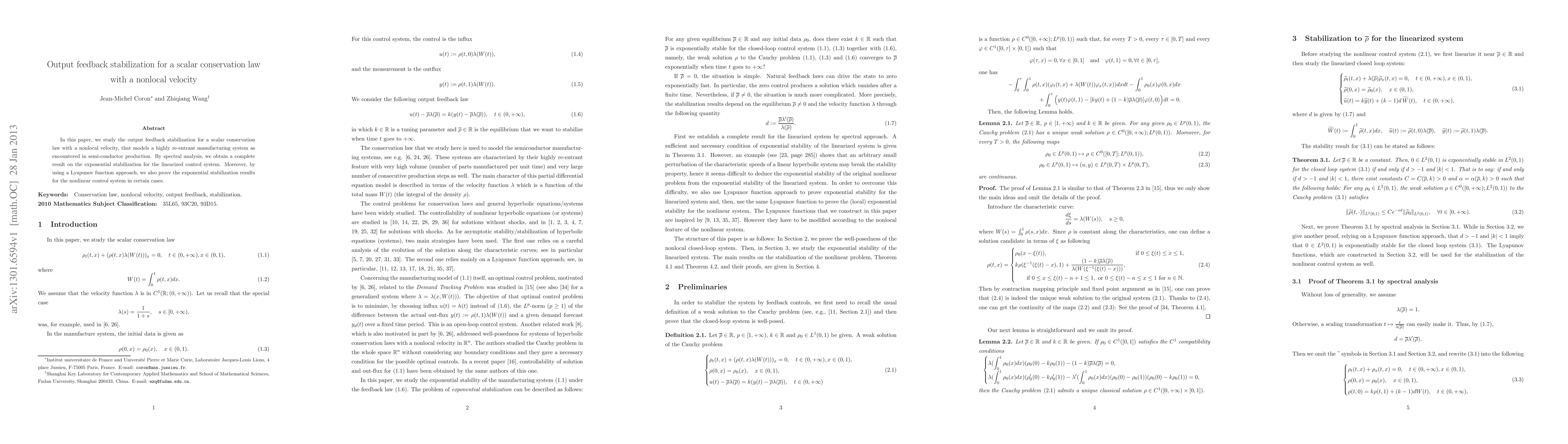 This paper investigates the output feedback stabilization for a scalar conservation law with a nonlocal velocity, modeling a re-entrant manufacturing system. It achieves exponential stabilization through spectral analysis for the linearized system and Lyapunov function approach for the nonlinear system in specific scenarios.