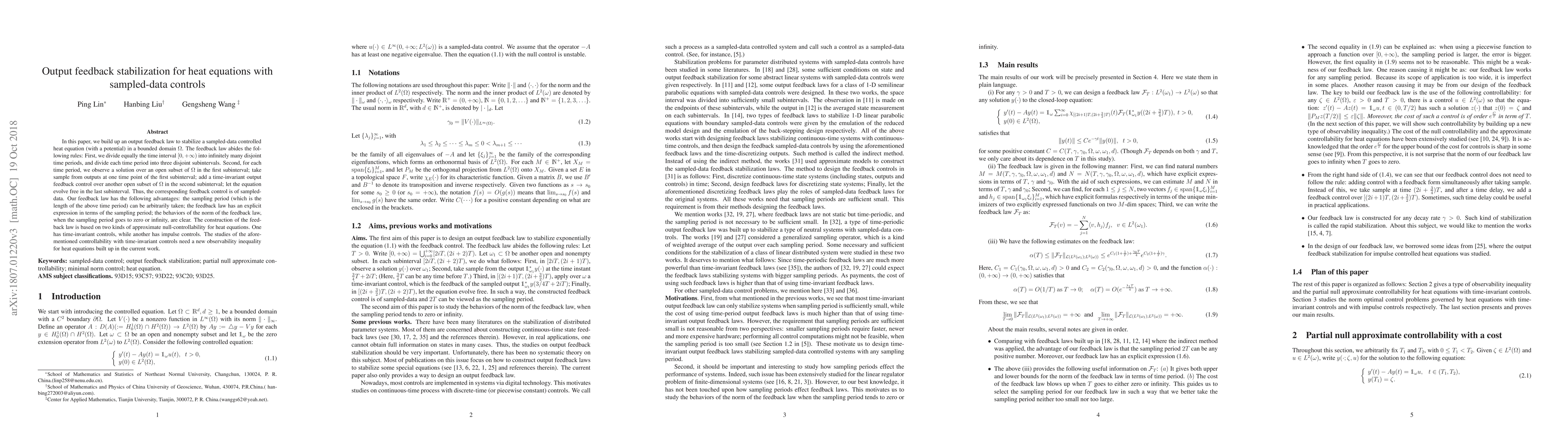 In this paper, we build up an output feedback law to stabilize a sampled-data controlled heat equation (with a potential) in a bounded domain $\Omega$. The feedback law abides the following rules: First, we divide equally the time interval $[0,+\infty)$ into infinitely many disjoint time periods, and divide each time period into three disjoint subintervals. Second, for each time period, we observe a solution over an open subset of $\Omega$ in the first subinterval, take sample from outputs at one time point of the first subinterval, add a time-invariant output feedback control over another open subset of $\Omega$ in the second subinterval; let the equation evolve free in the last subinterval. Thus, the corresponding feedback control is of sampled-data. Our feedback law has the following advantages: the sampling period (which is the length of the above time period) can be arbitrarily taken; the feedback law has an explicit expression in terms of the sampling period; the behaviors of the norm of the feedback law, when the sampling period goes to zero or infinity, are clear. The construction of the feedback law is based on two kinds of approximate null-controllability for heat equations. One has time-invariant controls, while another has impulse controls. The studies of the aforementioned controllability with time-invariant controls need a new observability inequality for heat equations built up in the current work.