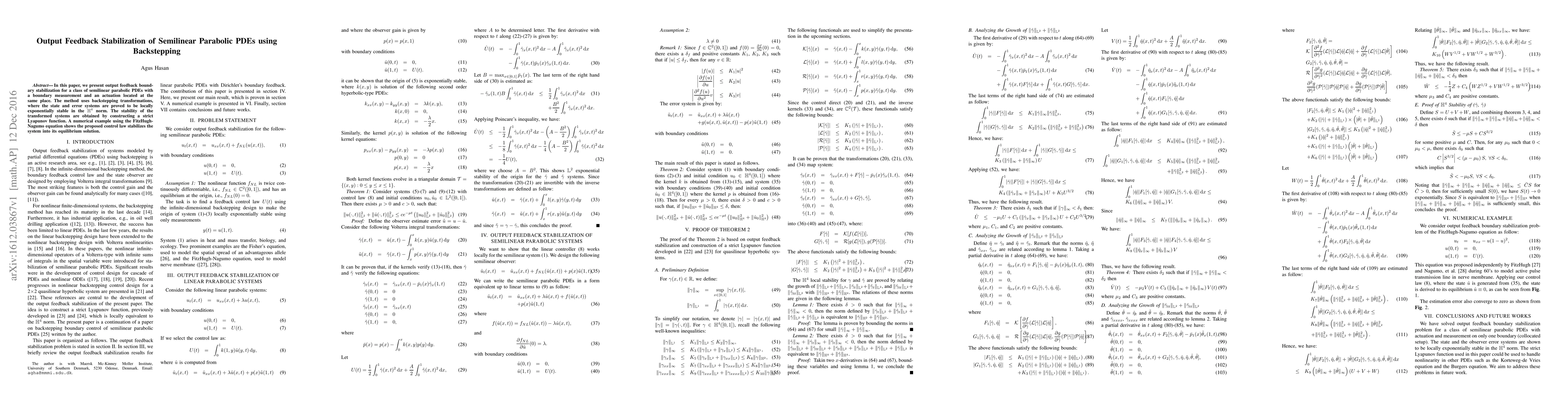 This paper proposes an output feedback stabilization method for semilinear parabolic PDEs using backstepping, ensuring local exponential stability in $\mathbb{H}^4$ norm. A strict Lyapunov function is constructed to demonstrate stability, and a numerical example with the FitzHugh-Nagumo equation validates the effectiveness of the proposed control law.