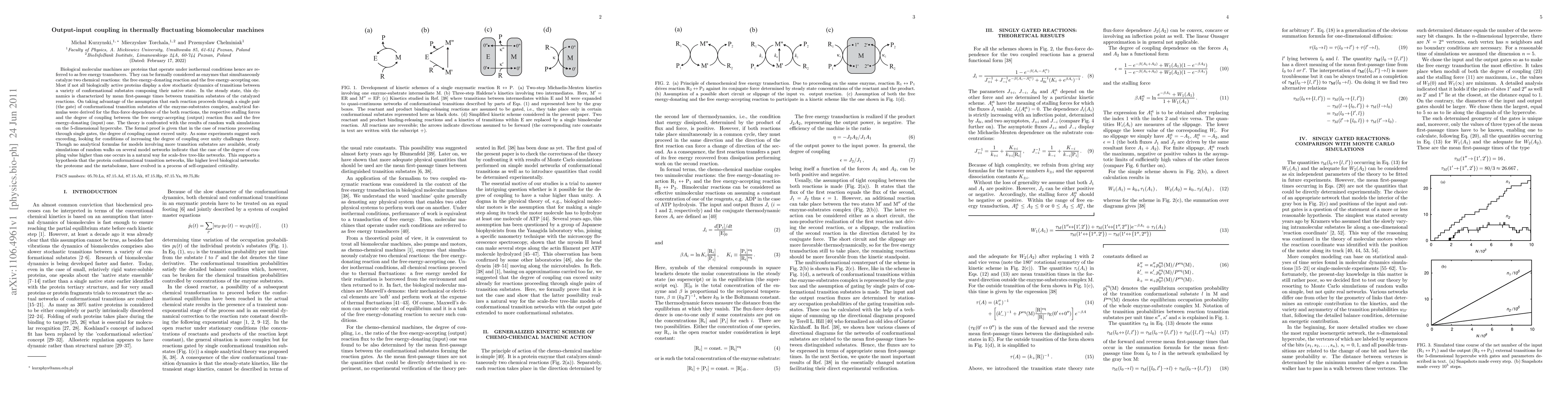 Biological molecular machines are proteins that operate under isothermal conditions hence are referred to as free energy transducers. They can be formally considered as enzymes that simultaneously catalyze two chemical reactions: the free energy-donating reaction and the free energy-accepting one. Most if not all biologically active proteins display a slow stochastic dynamics of transitions between a variety of conformational substates composing their native state. In the steady state, this dynamics is characterized by mean first-passage times between transition substates of the catalyzed reactions. On taking advantage of the assumption that each reaction proceeds through a single pair (the gate) of conformational transition substates of the enzyme-substrates complex, analytical formulas were derived for the flux-force dependence of the both reactions, the respective stalling forces and the degree of coupling between the free energy-accepting (output) reaction flux and the free energy-donating (input) one. The theory is confronted with the results of random walk simulations on the 5-dimensional hypercube. The formal proof is given that in the case of reactions proceeding through single gates, the degree of coupling cannot exceed unity. As some experiments suggest such exceeding, looking for conditions of increasing the degree of coupling over unity challenges theory. Though no analytical formulas for models involving more transition substates are available, study simulations of random walks on several model networks indicate that the case of the degree of coupling value higher than one occurs in a natural way for scale-free tree-like networks. This supports a hypothesis that the protein conformational transition networks, like higher level biological networks: the proteome and the metabolome, have evolved in a process of self-organized criticality.