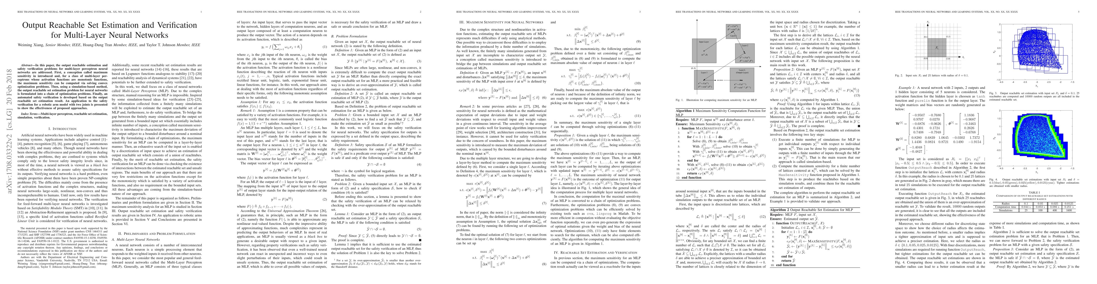 This paper proposes methods for estimating the output reachable set and verifying the safety of multi-layer neural networks by introducing maximum sensitivity and solving convex optimization problems. An automated safety verification method is developed and demonstrated through a robotic arm model.