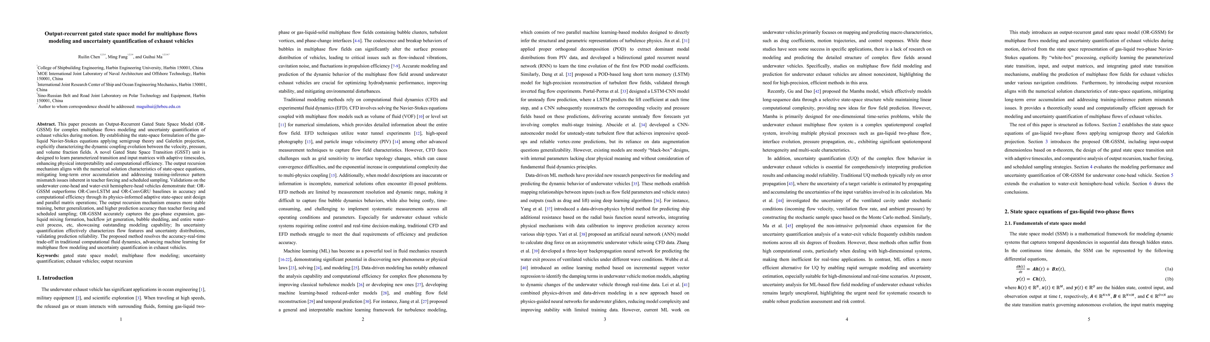 This paper presents an Output-Recurrent Gated State Space Model (OR-GSSM) for complex multiphase flows modeling and uncertainty quantification of exhaust vehicles during motion. By establishing the state-space formulation of the gas-liquid Navier-Stokes equations applying semigroup theory and Galerkin projection, explicitly characterizing the dynamic coupling evolution between the velocity, pressure, and volume fraction fields. A novel Gated State Space Transition (GSST) unit is designed to learn parameterized transition and input matrices with adaptive timescales, enhancing physical interpretability and computational efficiency. The output recursion mechanism aligns with the numerical solution characteristics of state-space equations, mitigating long-term error accumulation and addressing training-inference pattern mismatch issues inherent in teacher forcing and scheduled sampling. Validations on the underwater cone-head and water-exit hemisphere-head vehicles demonstrate that: OR-GSSM outperforms OR-ConvLSTM and OR-ConvGRU baselines in accuracy and computational efficiency through its physics-informed adaptive state-space unit design and parallel matrix operations; The output recursion mechanism ensures more stable training, better generalization, and higher prediction accuracy than teacher forcing and scheduled sampling; OR-GSSM accurately captures the gas-phase expansion, gas-liquid mixing formation, backflow jet generation, bubble shedding, and entire water-exit process, etc, showcasing outstanding modeling capability; Its uncertainty quantification effectively characterizes flow features and uncertainty distributions, validating prediction reliability. The proposed method resolves the accuracy-real-time trade-off in traditional computational fluid dynamics, advancing machine learning for multiphase flow modeling and uncertainty quantification in exhaust vehicles.