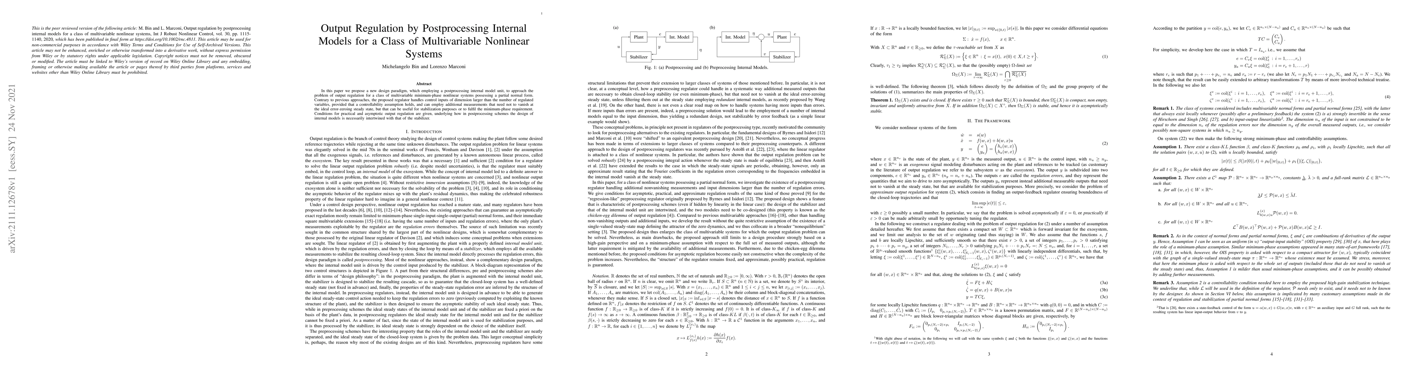 In this paper we propose a new design paradigm, which employing a postprocessing internal model unit, to approach the problem of output regulation for a class of multivariable minimum-phase nonlinear systems possessing a partial normal form. Contrary to previous approaches, the proposed regulator handles control inputs of dimension larger than the number of regulated variables, provided that a controllability assumption holds, and can employ additional measurements that need not to vanish at the ideal error-zeroing steady state, but that can be useful for stabilization purposes or to fulfil the minimum-phase requirement. Conditions for practical and asymptotic output regulation are given, underlying how in postprocessing schemes the design of internal models is necessarily intertwined with that of the stabilizer.