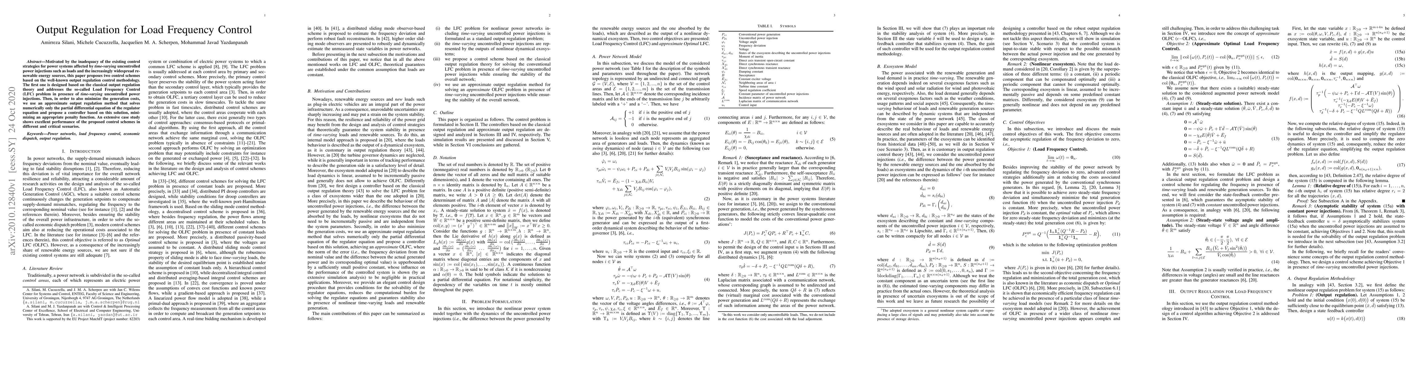 This paper proposes two control schemes for Load Frequency Control (LFC) in power systems, addressing time-varying uncontrolled power injections. The first scheme uses classical output regulation theory, while the second minimizes generation costs using an approximate output regulation method. Both schemes demonstrate excellent performance in critical scenarios.
