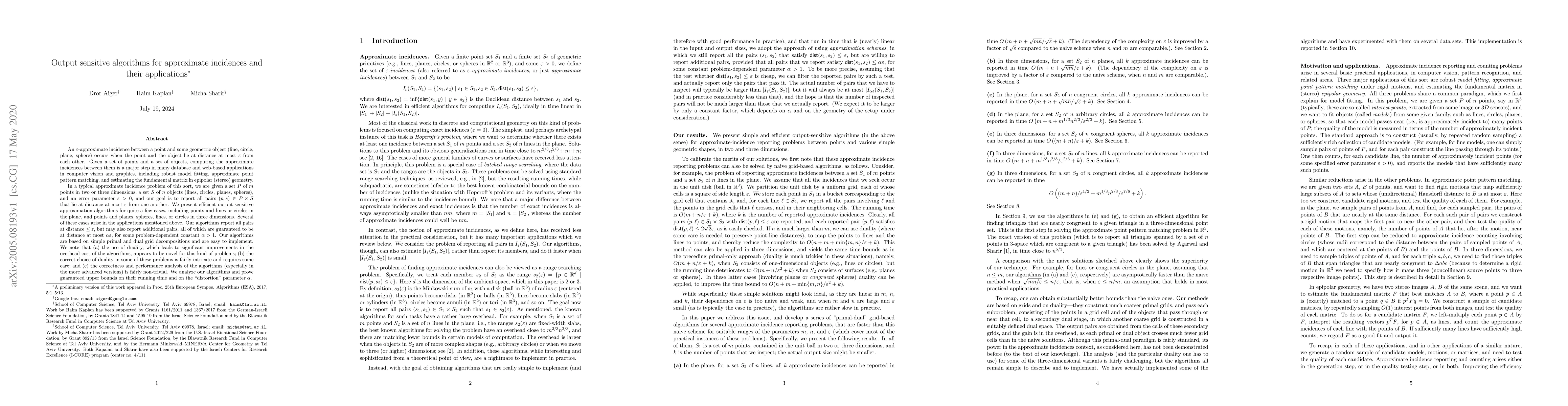 This paper introduces output-sensitive algorithms to efficiently compute approximate incidences between points and geometric objects (lines, circles, planes, spheres) in 2D and 3D spaces. These algorithms are crucial for various applications in computer vision and graphics, such as robust model fitting and fundamental matrix estimation in epipolar geometry.