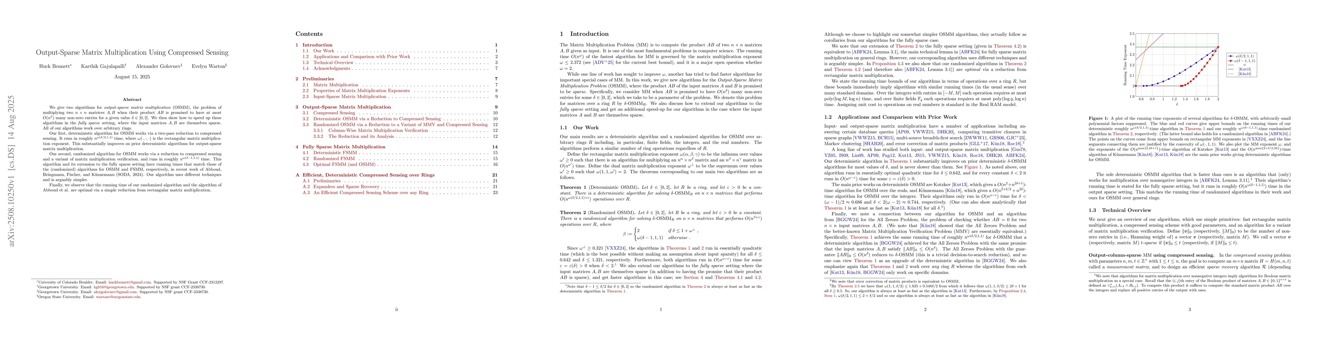 We give two algorithms for output-sparse matrix multiplication (OSMM), the problem of multiplying two $n \times n$ matrices $A, B$ when their product $AB$ is promised to have at most $O(n^{\delta})$ many non-zero entries for a given value $\delta \in [0, 2]$. We then show how to speed up these algorithms in the fully sparse setting, where the input matrices $A, B$ are themselves sparse. All of our algorithms work over arbitrary rings. Our first, deterministic algorithm for OSMM works via a two-pass reduction to compressed sensing. It runs in roughly $n^{\omega(\delta/2, 1, 1)}$ time, where $\omega(\cdot, \cdot, \cdot)$ is the rectangular matrix multiplication exponent. This substantially improves on prior deterministic algorithms for output-sparse matrix multiplication. Our second, randomized algorithm for OSMM works via a reduction to compressed sensing and a variant of matrix multiplication verification, and runs in roughly $n^{\omega(\delta - 1, 1, 1)}$ time. This algorithm and its extension to the fully sparse setting have running times that match those of the (randomized) algorithms for OSMM and FSMM, respectively, in recent work of Abboud, Bringmann, Fischer, and K\"{u}nnemann (SODA, 2024). Our algorithm uses different techniques and is arguably simpler. Finally, we observe that the running time of our randomized algorithm and the algorithm of Abboud et al. are optimal via a simple reduction from rectangular matrix multiplication.