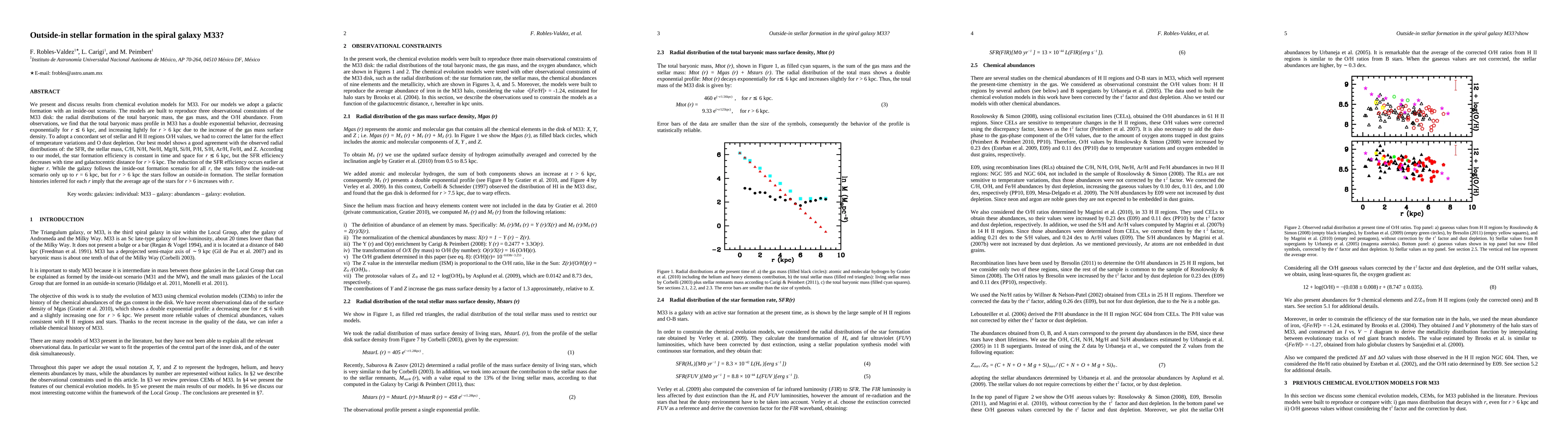 We present and discuss results from chemical evolution models for M33. For our models we adopt a galactic formation with an inside-out scenario. The models are built to reproduce three observational constraints of the M33 disk: the radial distributions of the total baryonic mass, the gas mass, and the O/H abundance. From observations, we find that the total baryonic mass profile in M33 has a double exponential behavior, decreasing exponentially for r<= 6 kpc, and increasing lightly for r > 6 kpc due to the increase of the gas mass surface density. To adopt a concordant set of stellar and H II regions O/H values, we had to correct the latter for the effect of temperature variations and O dust depletion. Our best model shows a good agreement with the observed the radial distributions of: the SFR, the stellar mass, C/H, N/H, Ne/H, Mg/H, Si/H, P/H, S/H, Ar/H, Fe/H,and Z. According to our model, the star formation efficiency is constant in time and space for r <= 6 kpc, but the SFR efficiency decreases with time and galactocentric distance for r > 6 kpc. The reduction of the SFR efficiency occurs earlier at higher r. While the galaxy follows the inside-out formation scenario for all r, the stars follow the inside-out scenario only up to r = 6 kpc, but for r > 6 kpc the stars follow an outside-in formation. The stellar formation histories inferred for each r imply that the average age of the stars for r > 6 increases with r.