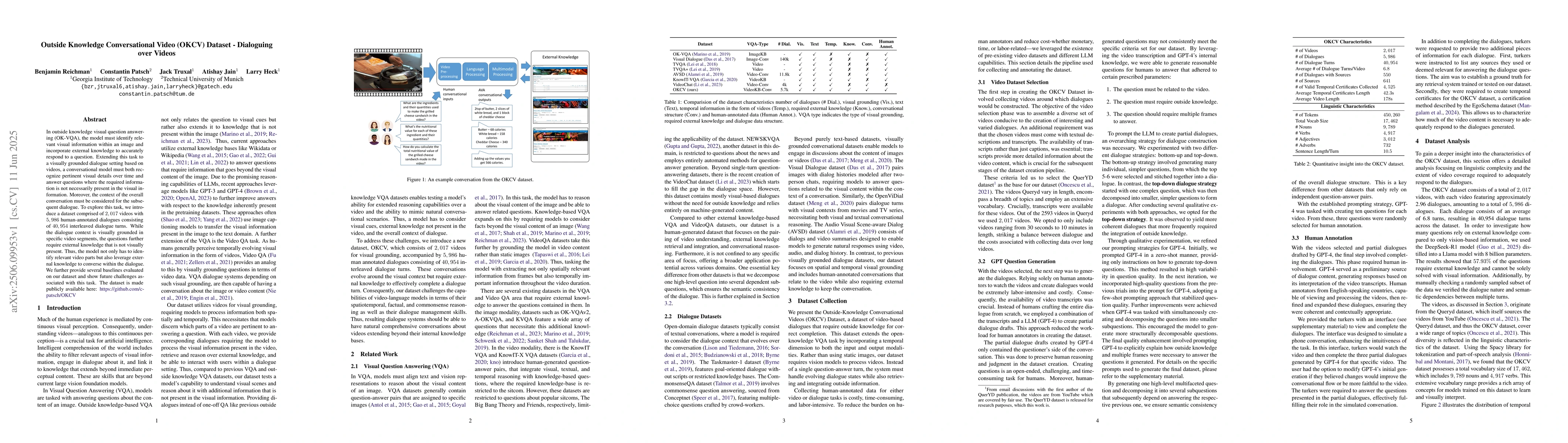 A new dataset called OKCV is introduced to study conversational video dialogue, where models must identify visual details, leverage external knowledge, and consider conversation context.