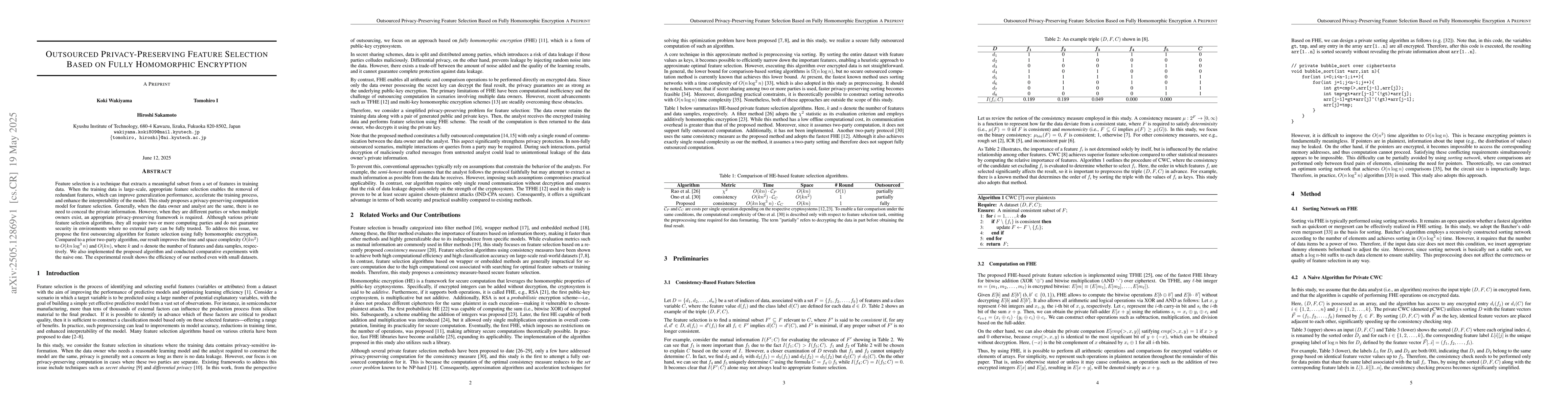 The research proposes an outsourced privacy-preserving computation model for feature selection using fully homomorphic encryption, improving upon previous two-party algorithms with reduced time and space complexity.
