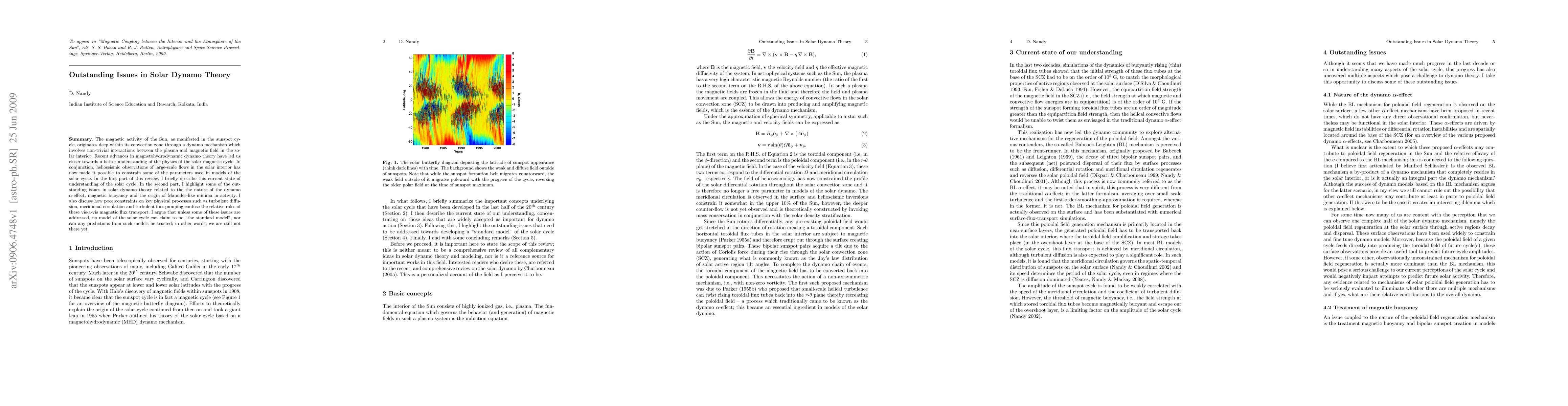 A review paper discusses outstanding issues in solar dynamo theory, including the nature of the dynamo $eta$-effect, magnetic buoyancy, and the origin of Maunder-like minima, highlighting the need for further research to improve understanding of the Sun's magnetic cycle.
