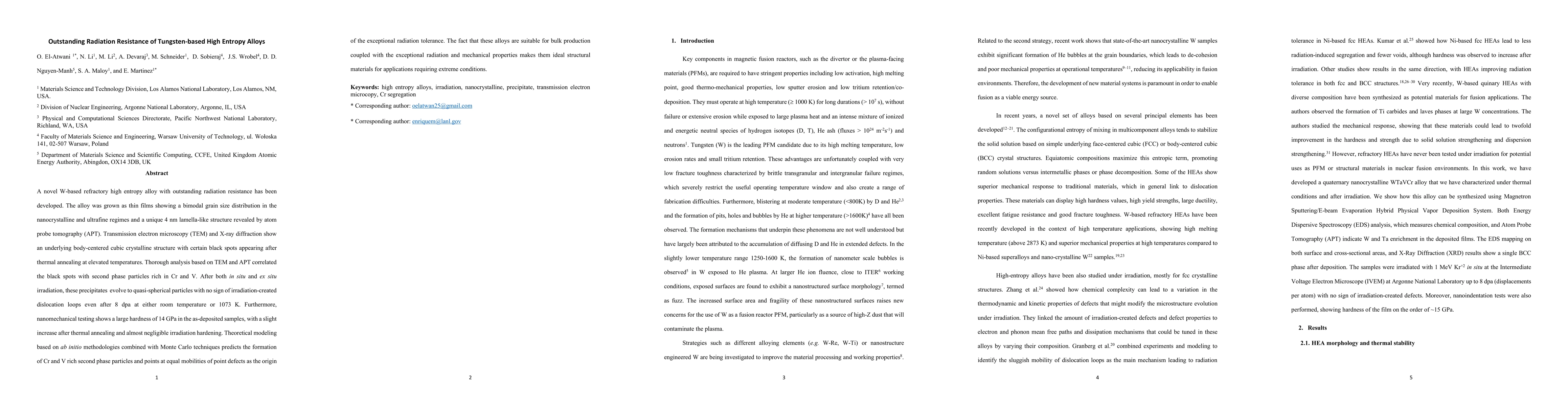 This paper reports on the development of a novel tungsten-based high entropy alloy with exceptional radiation resistance, characterized by a bimodal grain size distribution and a unique lamella-like structure. The alloy exhibits negligible irradiation hardening and outstanding mechanical properties, making it a promising material for extreme condition applications.