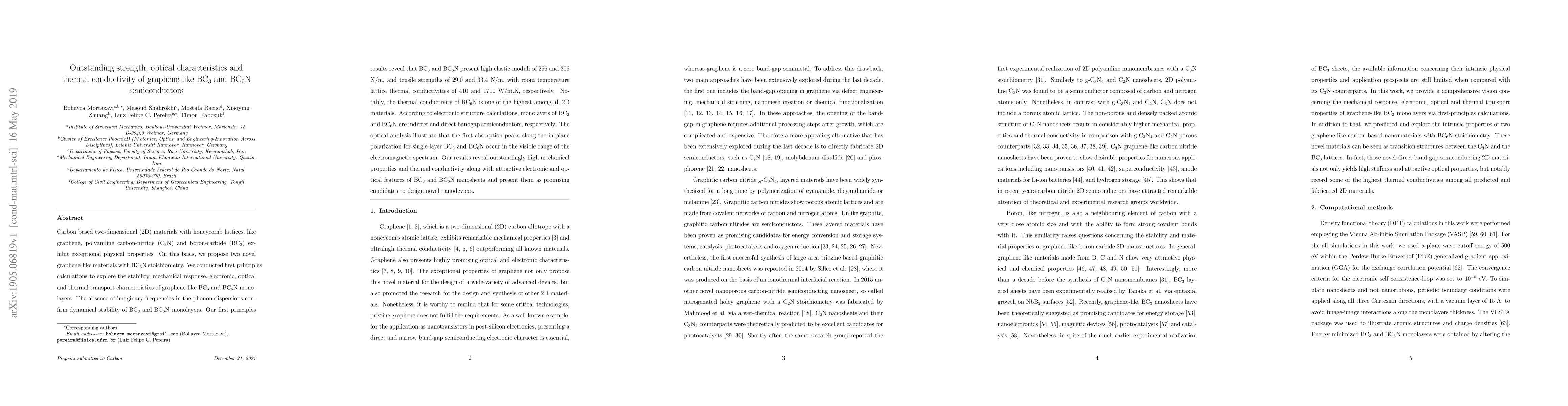 This paper investigates the mechanical, electronic, optical, and thermal properties of novel graphene-like BC$_3$ and BC$_6$N semiconductors using first-principles calculations. The materials exhibit outstanding mechanical strength, high thermal conductivity, and attractive electronic and optical characteristics, making them promising candidates for advanced nanodevices.