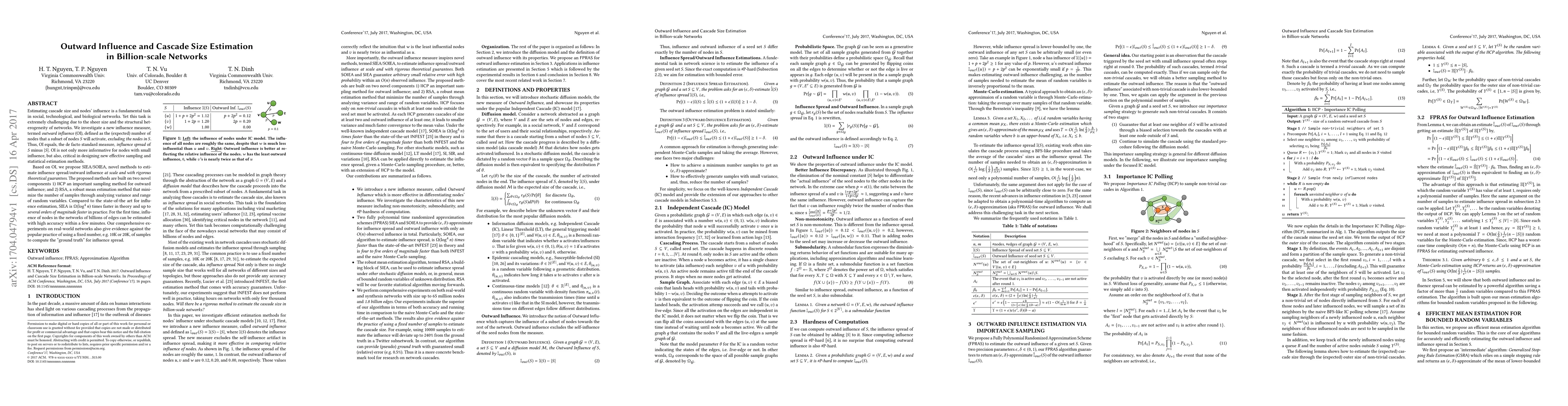 Estimating cascade size and nodes' influence is a fundamental task in social, technological, and biological networks. Yet this task is extremely challenging due to the sheer size and the structural heterogeneity of networks. We investigate a new influence measure, termed outward influence (OI), defined as the (expected) number of nodes that a subset of nodes $S$ will activate, excluding the nodes in S. Thus, OI equals, the de facto standard measure, influence spread of S minus |S|. OI is not only more informative for nodes with small influence, but also, critical in designing new effective sampling and statistical estimation methods. Based on OI, we propose SIEA/SOIEA, novel methods to estimate influence spread/outward influence at scale and with rigorous theoretical guarantees. The proposed methods are built on two novel components 1) IICP an important sampling method for outward influence, and 2) RSA, a robust mean estimation method that minimize the number of samples through analyzing variance and range of random variables. Compared to the state-of-the art for influence estimation, SIEA is $\Omega(\log^4 n)$ times faster in theory and up to several orders of magnitude faster in practice. For the first time, influence of nodes in the networks of billions of edges can be estimated with high accuracy within a few minutes. Our comprehensive experiments on real-world networks also give evidence against the popular practice of using a fixed number, e.g. 10K or 20K, of samples to compute the "ground truth" for influence spread.