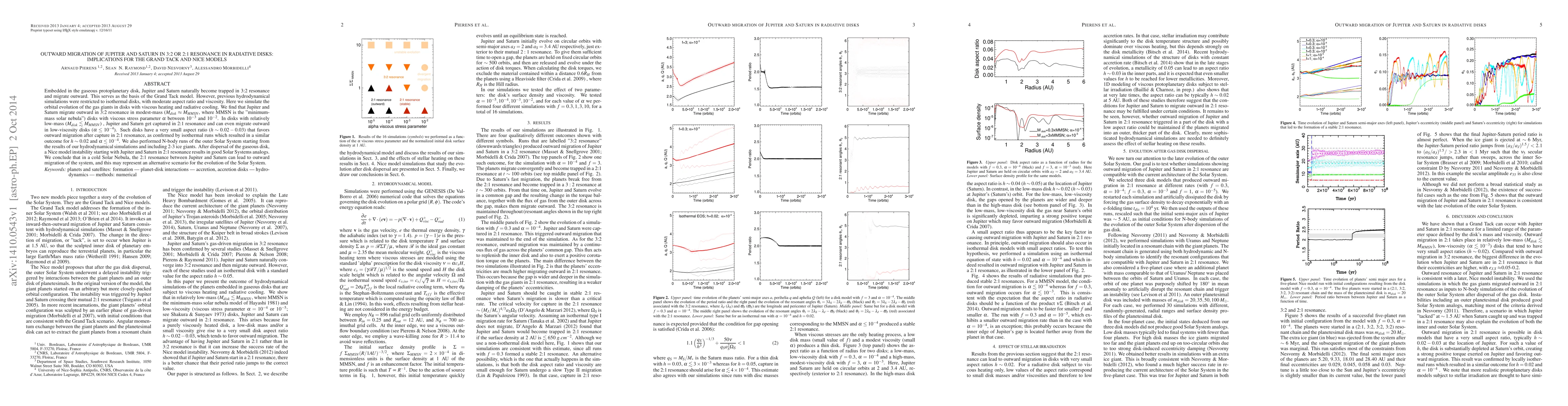 This study explores the outward migration of Jupiter and Saturn in radiative protoplanetary disks, finding that they can migrate in 3:2 or 2:1 resonance depending on disk mass and viscosity. The results suggest an alternative scenario for the Solar System's evolution, supporting the Nice model instability starting with the planets in 2:1 resonance.