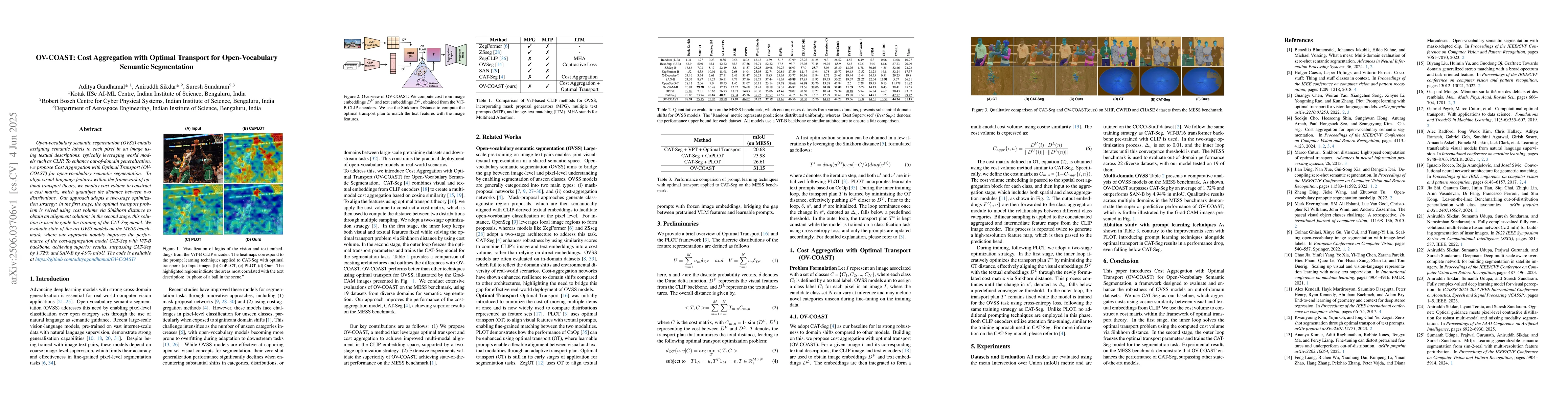 OV-COAST differentiates itself by integrating optimal transport theory with cost aggregation for open-vocabulary semantic segmentation, outperforming existing methods on the MESS benchmark.