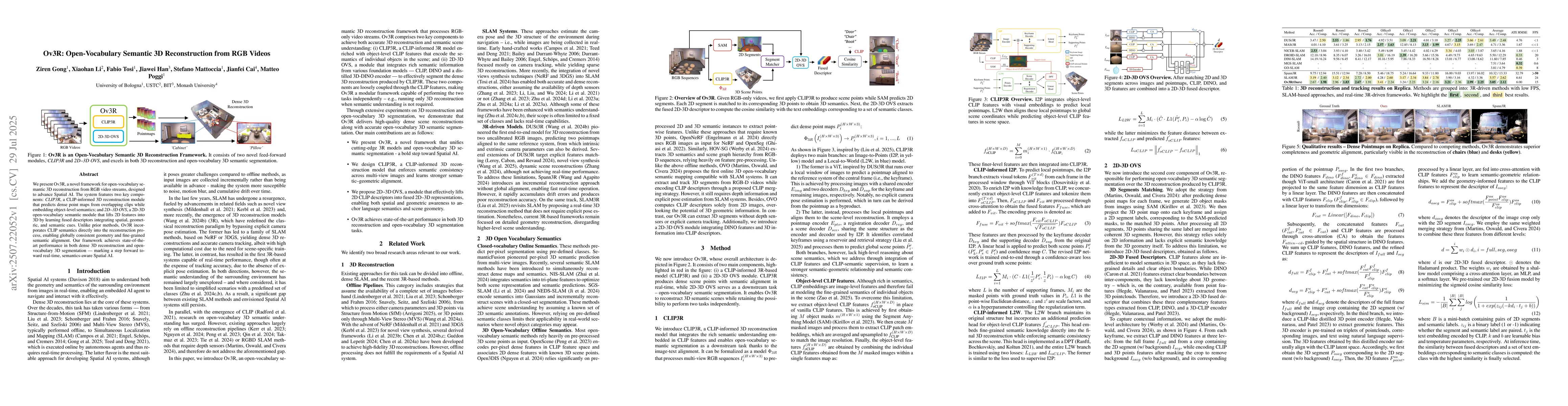 We present Ov3R, a novel framework for open-vocabulary semantic 3D reconstruction from RGB video streams, designed to advance Spatial AI. The system features two key components: CLIP3R, a CLIP-informed 3D reconstruction module that predicts dense point maps from overlapping clips while embedding object-level semantics; and 2D-3D OVS, a 2D-3D open-vocabulary semantic module that lifts 2D features into 3D by learning fused descriptors integrating spatial, geometric, and semantic cues. Unlike prior methods, Ov3R incorporates CLIP semantics directly into the reconstruction process, enabling globally consistent geometry and fine-grained semantic alignment. Our framework achieves state-of-the-art performance in both dense 3D reconstruction and open-vocabulary 3D segmentation, marking a step forward toward real-time, semantics-aware Spatial AI.
