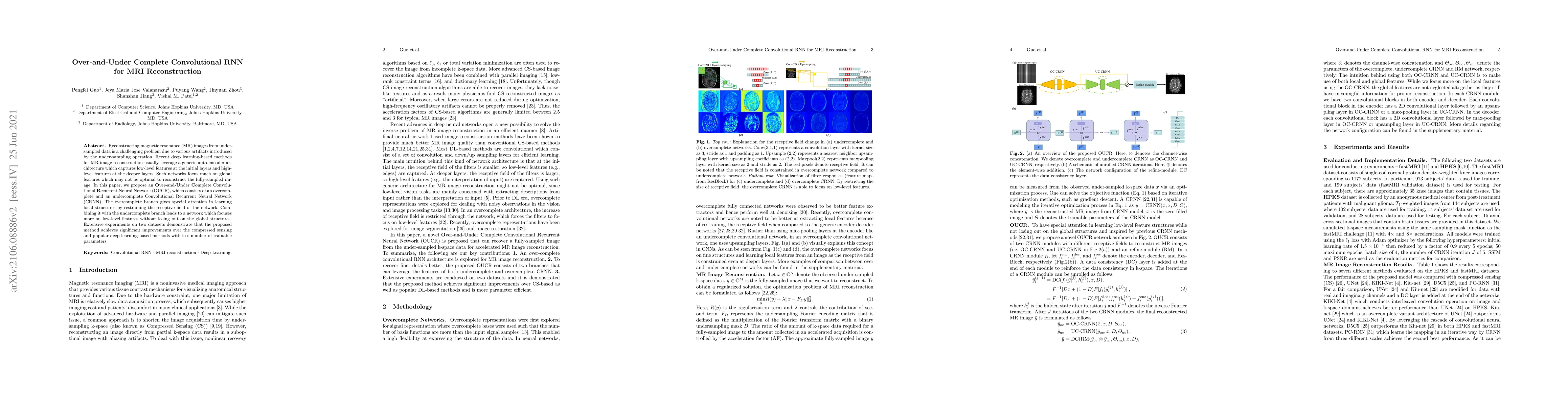 Reconstructing magnetic resonance (MR) images from undersampled data is a challenging problem due to various artifacts introduced by the under-sampling operation. Recent deep learning-based methods for MR image reconstruction usually leverage a generic auto-encoder architecture which captures low-level features at the initial layers and high-level features at the deeper layers. Such networks focus much on global features which may not be optimal to reconstruct the fully-sampled image. In this paper, we propose an Over-and-Under Complete Convolutional Recurrent Neural Network (OUCR), which consists of an overcomplete and an undercomplete Convolutional Recurrent Neural Network(CRNN). The overcomplete branch gives special attention in learning local structures by restraining the receptive field of the network. Combining it with the undercomplete branch leads to a network which focuses more on low-level features without losing out on the global structures. Extensive experiments on two datasets demonstrate that the proposed method achieves significant improvements over the compressed sensing and popular deep learning-based methods with less number of trainable parameters.