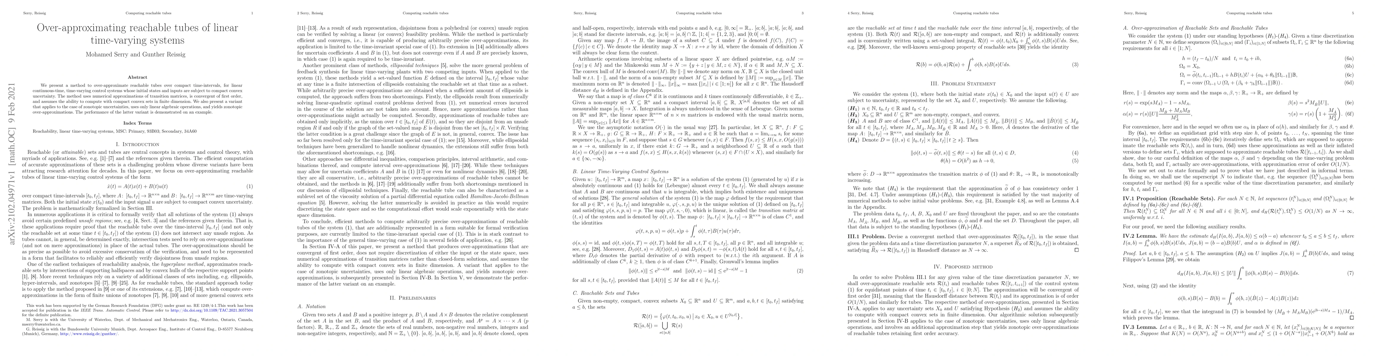 We present a method to over-approximate reachable tubes over compact time-intervals, for linear continuous-time, time-varying control systems whose initial states and inputs are subject to compact convex uncertainty. The method uses numerical approximations of transition matrices, is convergent of first order, and assumes the ability to compute with compact convex sets in finite dimension. We also present a variant that applies to the case of zonotopic uncertainties, uses only linear algebraic operations, and yields zonotopic over-approximations. The performance of the latter variant is demonstrated on an example.
