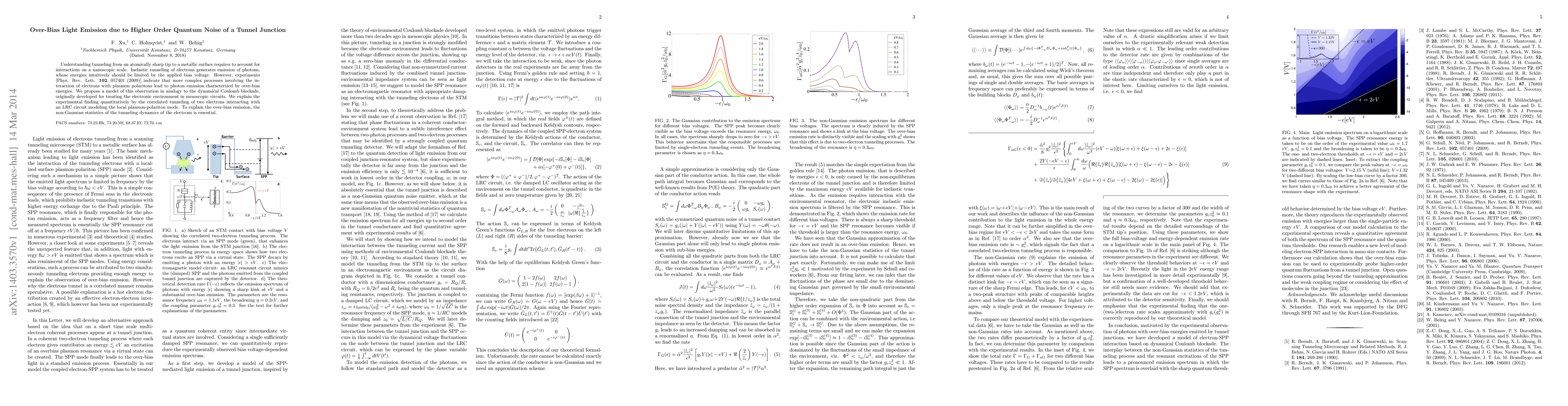 Understanding tunneling from an atomically sharp tip to a metallic surface requires to account for interactions on a nanoscopic scale. Inelastic tunneling of electrons generates emission of photons, whose energies intuitively should be limited by the applied bias voltage. However, experiments by Schull et al. [Phys. Rev. Lett. 102, 057401 (2009)] indicate that more complex processes involving the interaction of electrons with plasmon polaritons lead to photon emission characterized by over-bias energies. We propose a model of this observation in analogy to dynamical Coulomb blockade, originally developed for treating the electronic environment in mesoscopic circuits. We explain the experimental finding quantitatively by the correlated tunneling of two electrons interacting with an LRC circuit modeling the local plasmon-polariton mode. To explain the over-bias emission, the non-Gaussian statistics of the tunneling dynamics of the electrons is essential.